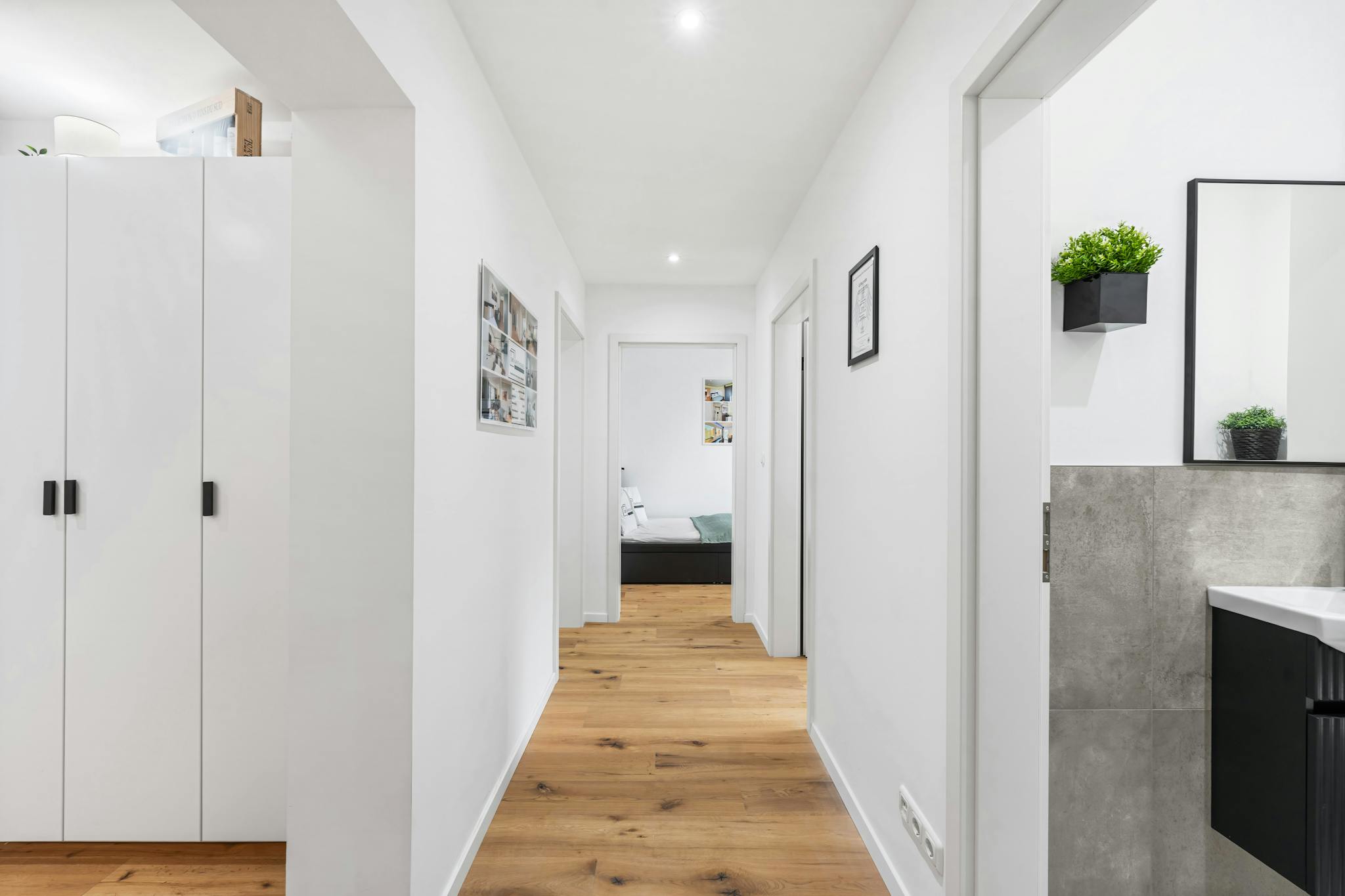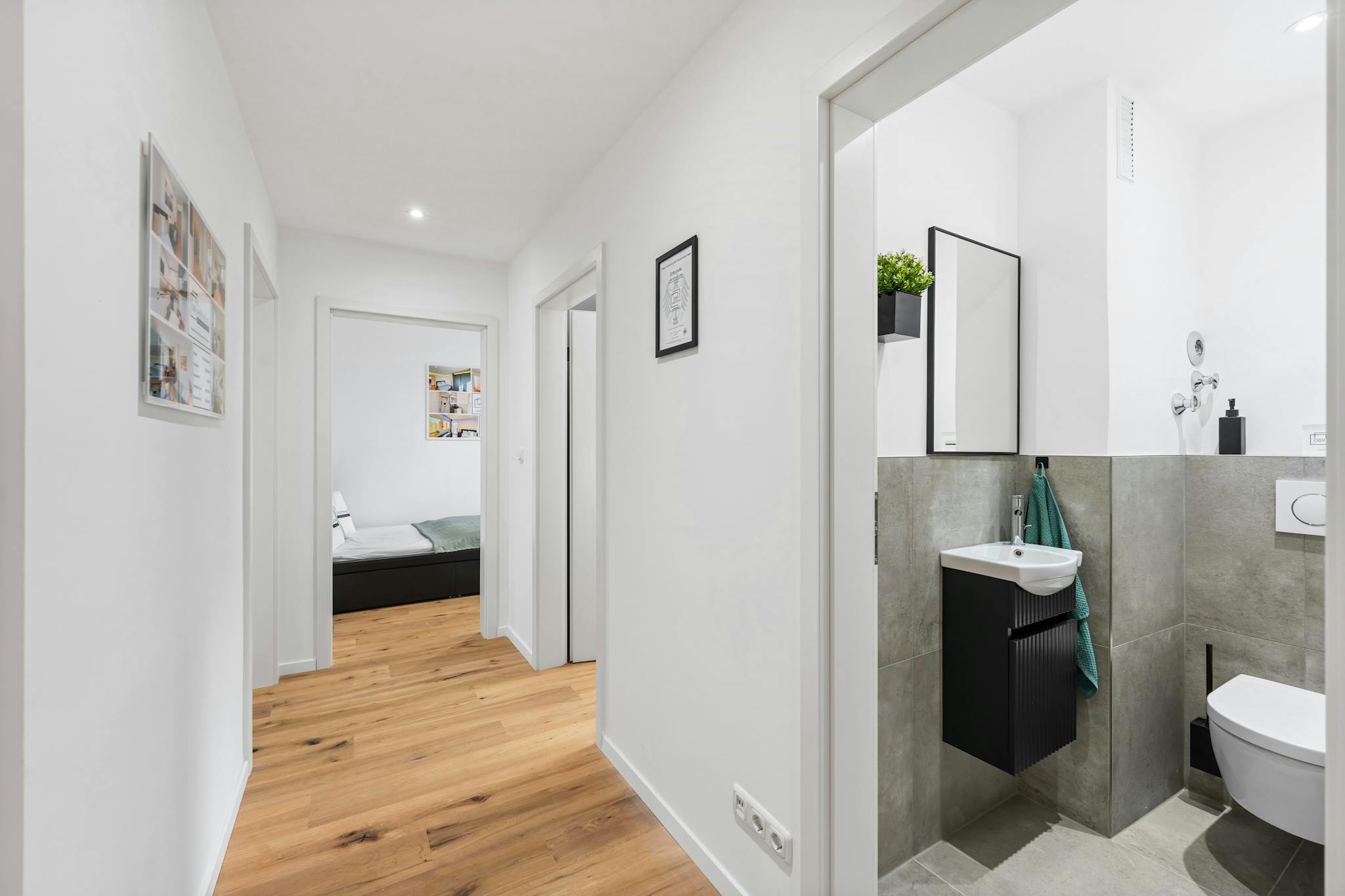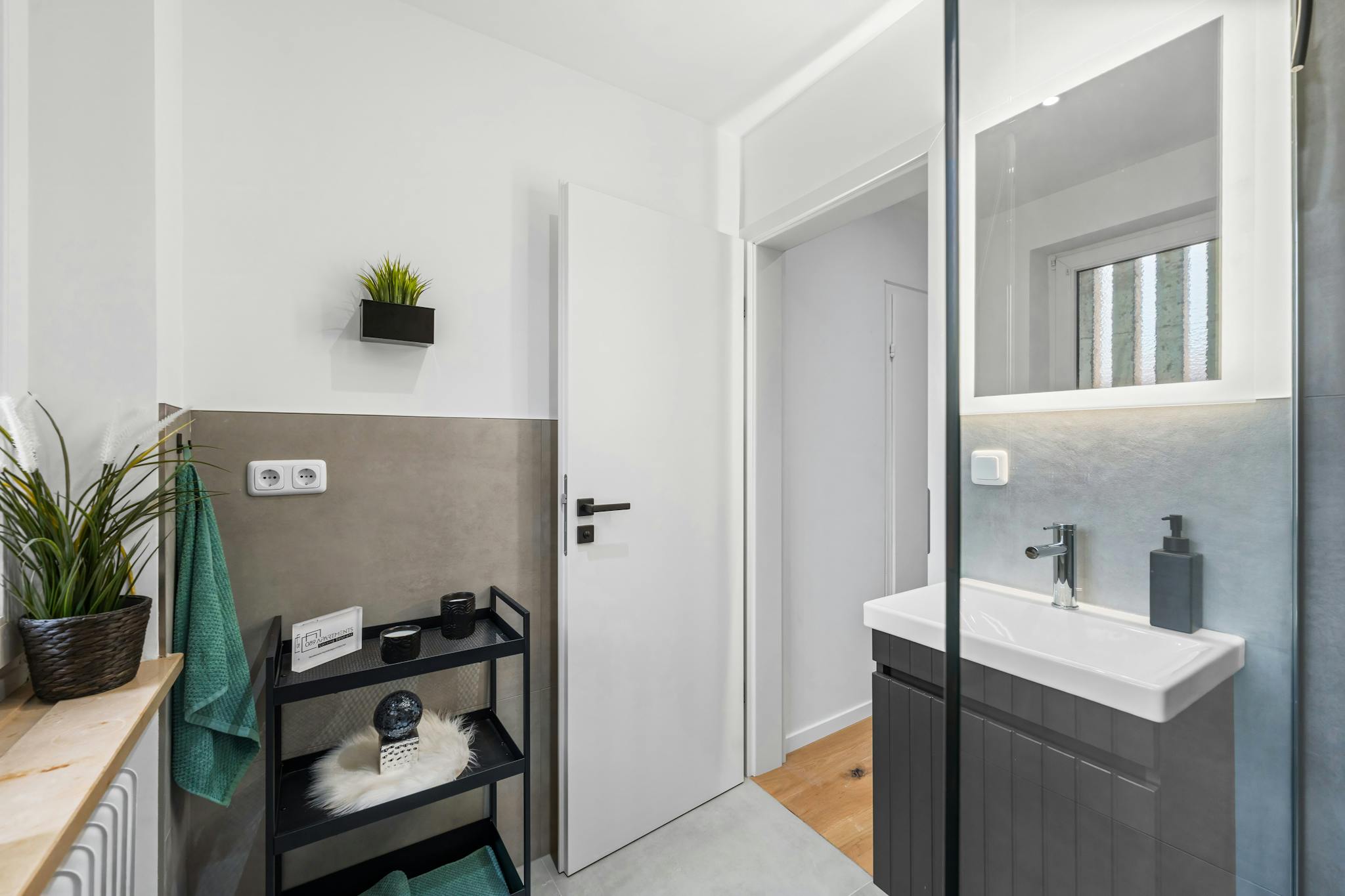 The generous hallway gives a very inviting impression and provides access to all rooms of the large apartment. The apartment also has a newly furnished bathroom, with a washbasin and LED mirror, a towel radiator and a shower as well as a toilet.