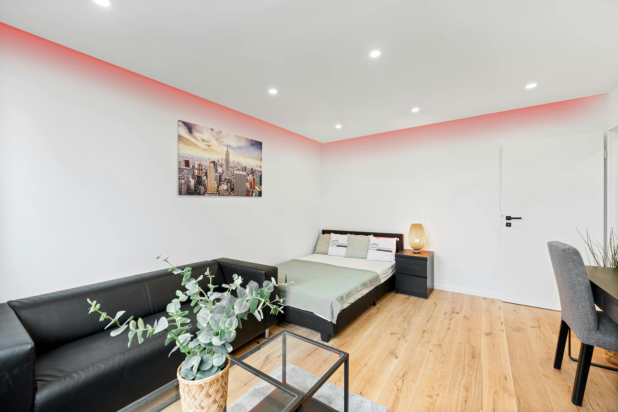 The table and floor lamps, plants, TV, and office supplies shown in the pictures are for illustration purposes only and are not included with the rental. The pictures are reference pictures because the apartment is not finished yet.