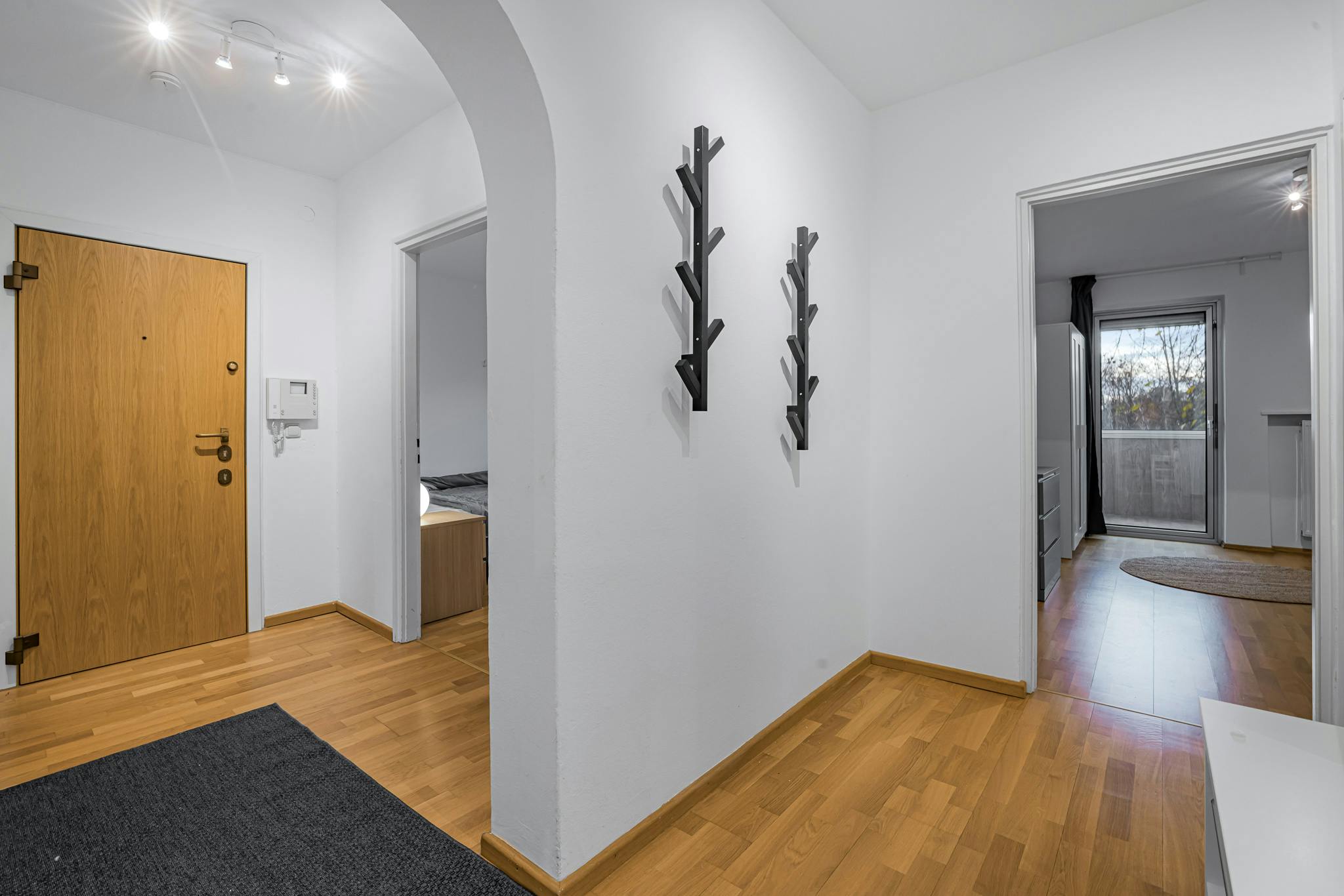 The apartment features two bathrooms: one with a relaxing bathtub and an additional WC that provides extra convenience. The welcoming dining area encourages communal dining and sharing daily experiences, while the generous hallway fosters a friendly, open atmosphere, making the living space even more inviting.