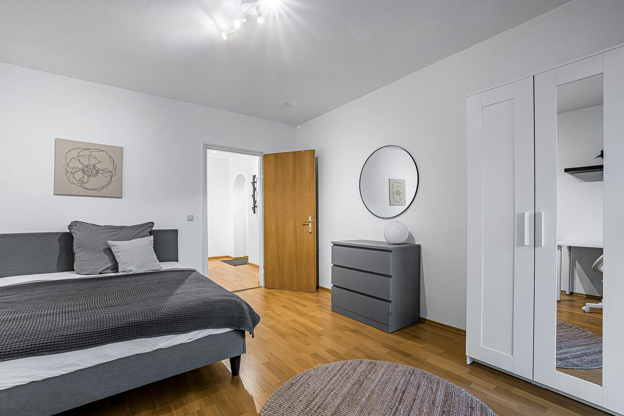 The room is furnished with a comfortable, large bed that promises restful nights. A practical, spacious desk provides ample space for focused work or study, while the stylish dresser adds extra storage and beautifully complements the wardrobe.