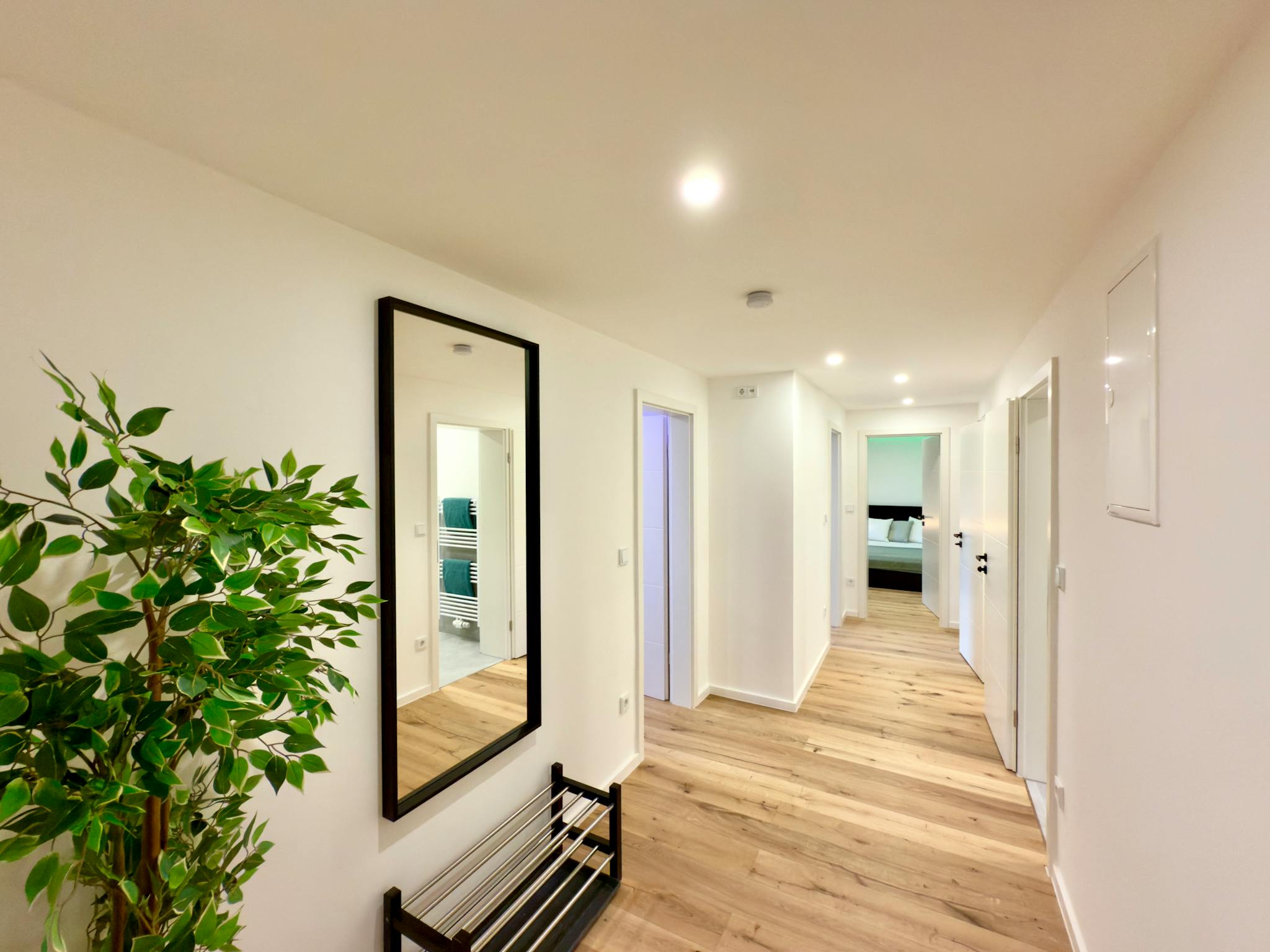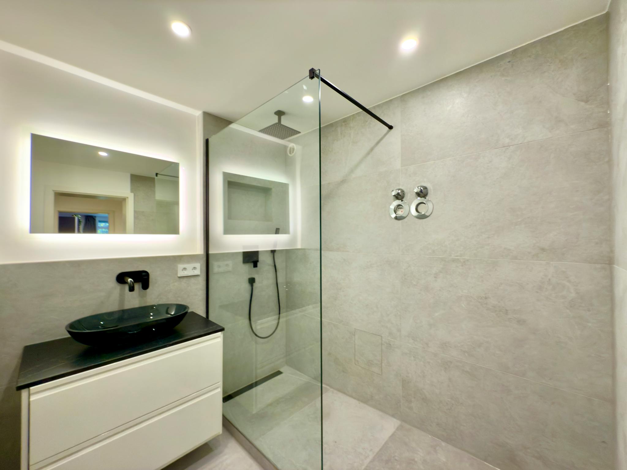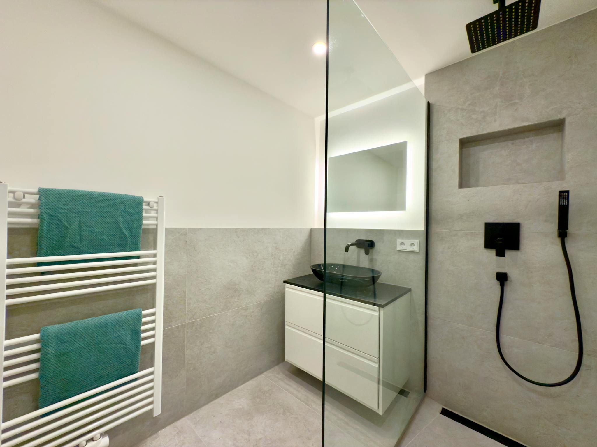 The generous hallway gives a very inviting impression and provides access to all rooms of the large apartment. The apartment also has a newly furnished bathroom, with a washbasin and LED mirror, a towel radiator and a shower as well as a toilet.