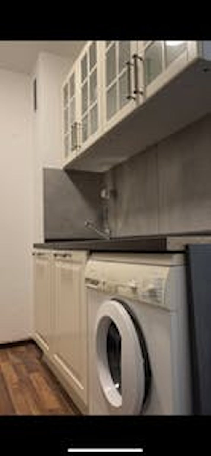 The apartment includes shared access to a modern bathroom and a separate toilet. The kitchen is fully equipped with essential appliances for cooking, and a washing machine is available for communal use, adding convenience to daily living.