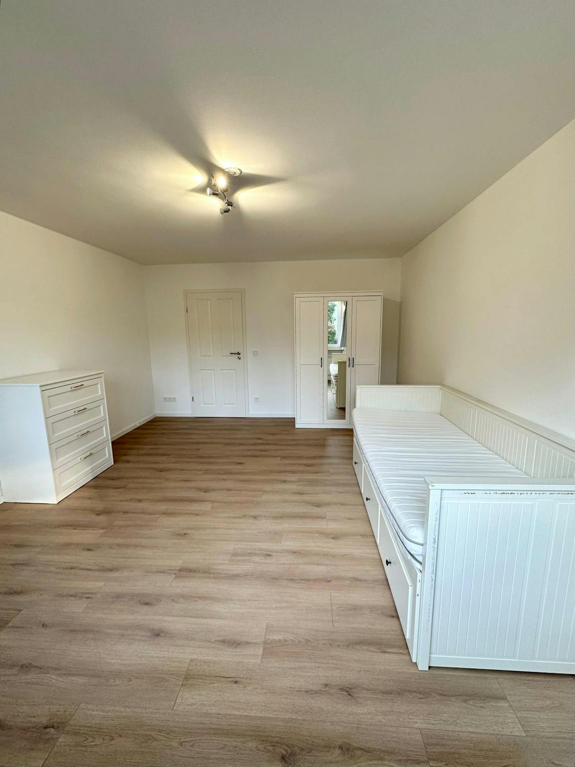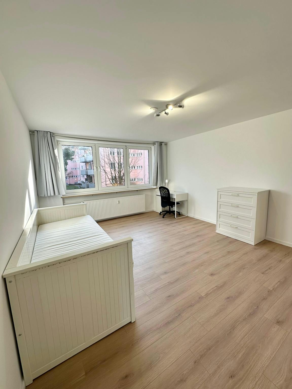 Your room has a double bed (Ikea Hemnes, pull-out, 160x200 cm), 1 wardrobe and 1 desk with chair and a table lamp.
