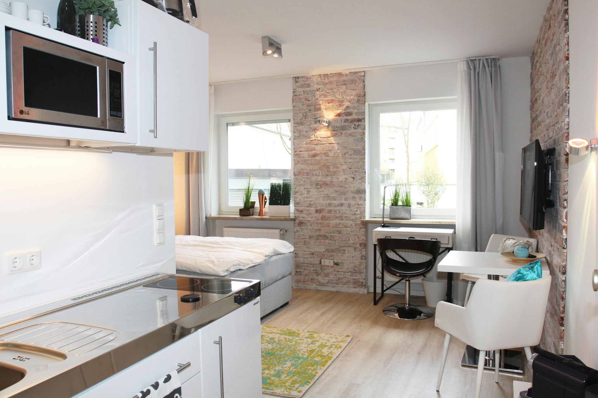 Tolles neu saniertes & möbliertes 1-Zimmer-Apartment in Giesing der Luxusklasse, Hochpaterre m. Lift. Traumhaft ruhiges Umfeld mit direktem Blick in den Weißenseepark. Kombiniertes Wohn-/Schlafzimmer, mit neuem Boxspringbett mit Taschenfederkern, Gel-Topper 140 x 200 cm für einen fantastischen Schlaf, Esstisch mit 2 Stühlen, Regale, Großer Spiegel Kleiderschrank, Leseecke. Modernes Luxus Bad mit Regenschauer Dusche. Praktische neue Küche mit weißen Fronten, Geschirrspülmaschine, Kühlschrank mit Eisfach, Ceranfeld und LG Mikrowelle.