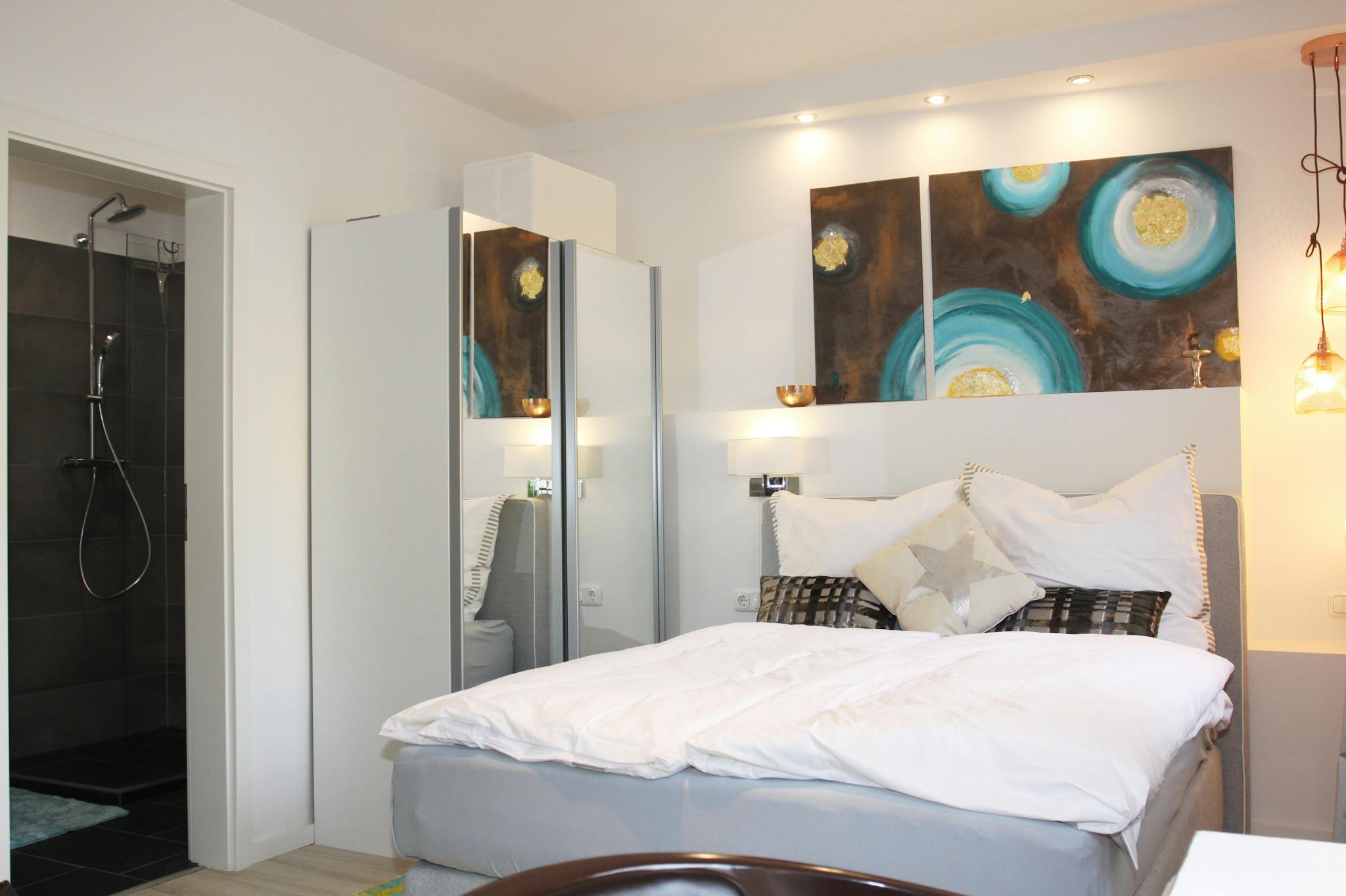 Luxury, newly renovated & furnished 1 room apartment in Giesing, located on the floor, with lift. Beautifully quiet environment with direct view into the Weißenseepark. Combined living/bedroom, with new box spring bed with pocket spring core, gel topper 140 x 200 cm for a fantastic sleep, dining table with 2 chairs, shelves, large mirror, wardrobe, reading corner. Modern luxury bathroom with rain shower. Practical new kitchen with white fronts, dishwasher, refrigerator with freezer compartment, ceramic hob and LG microwave.