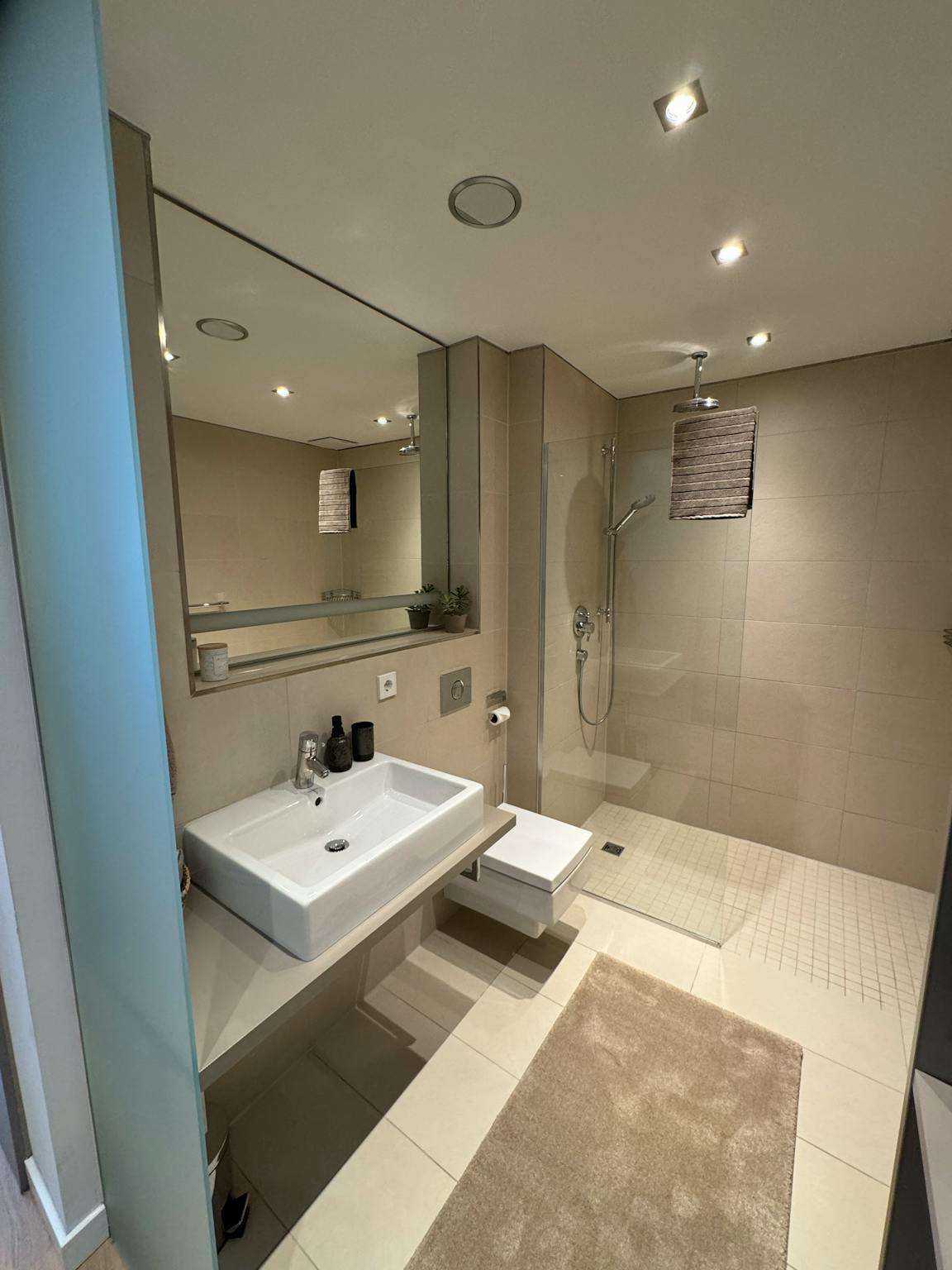- Modern creamy tiled bathroom with shower