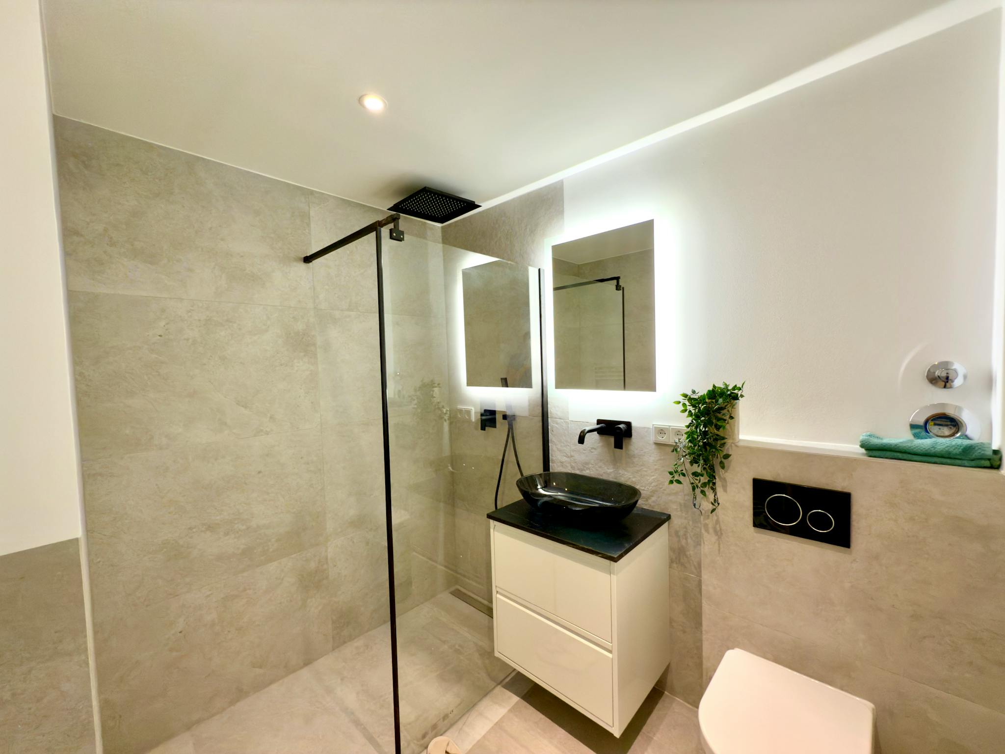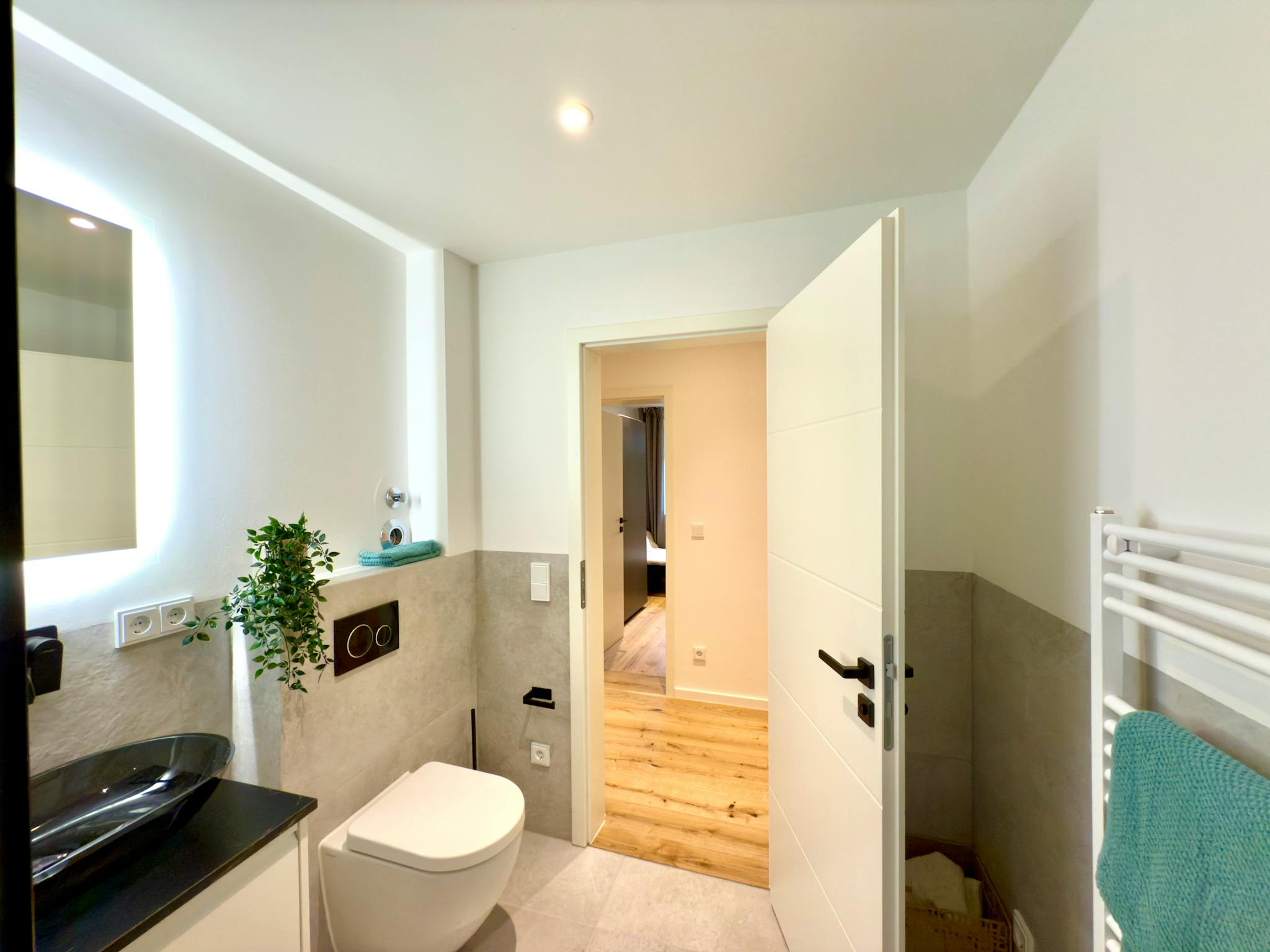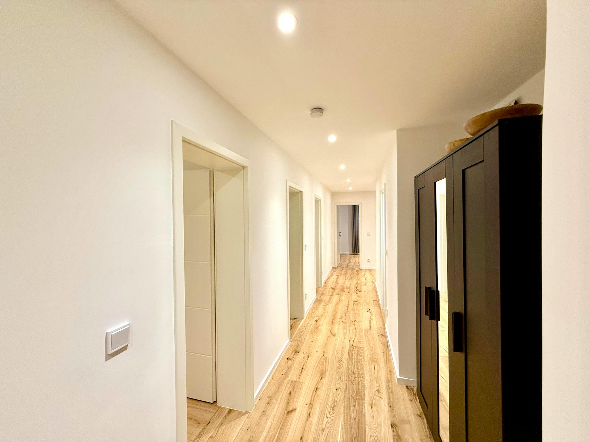 The generous hallway gives a very inviting impression and provides access to all rooms of the large apartment. The apartment also has a newly furnished bathroom, with a washbasin and LED mirror, a towel radiator and a shower as well as a toilet.