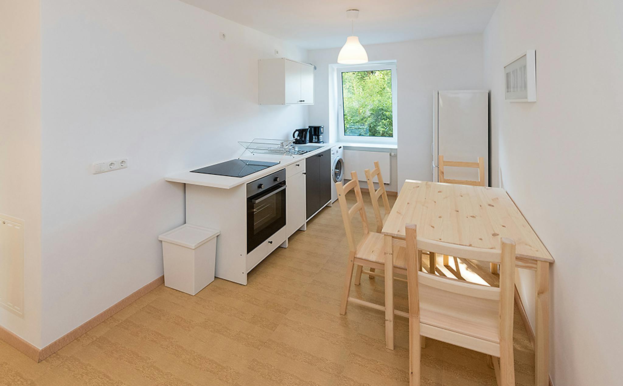Our flats fulfil all your daily living requirements. Every flat comes readily equipped with a kitchen, including refrigerator, cooking equipment and dishes. Flats also include a washing machine and Wi-Fi Internet. Each room is fully furnished and offers a comfortable bed with fresh linen and a workspace. The area provides you with several shopping opportunities and excellent connections to public transport.
