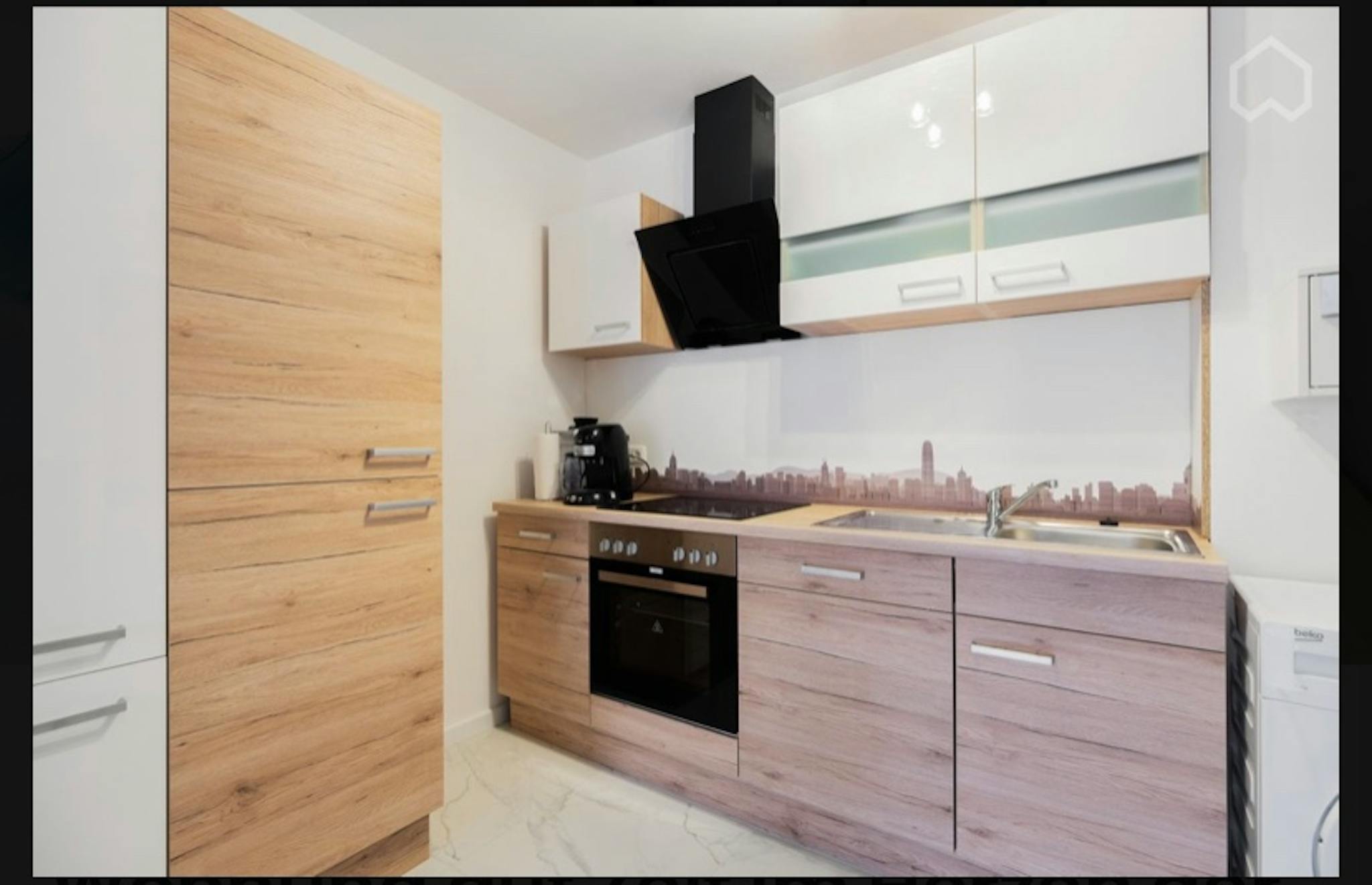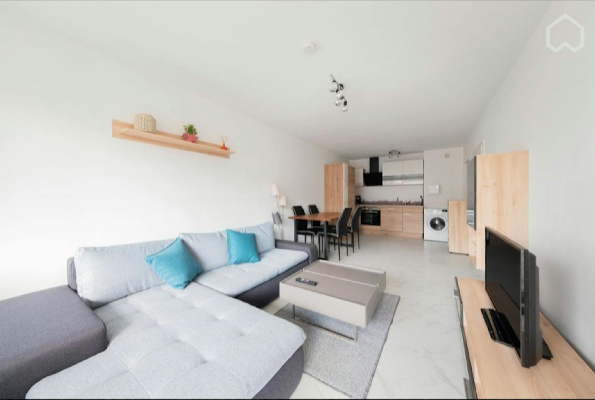 The very modern bathroom with bathtub, shower and toilet is in shiny white. We also provide you with an iron, ironing board, drying rack and a vacuum cleaner. There is also a washing machine in the apartment.