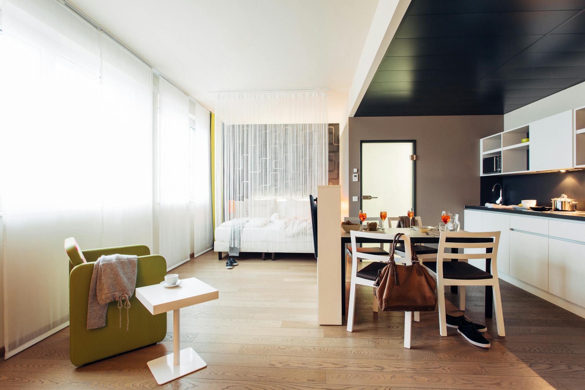Our place Munich in the borough of Moosach is located directly next to the S-Bahn, to the metro line U3 and to a shopping center. The hotel is accessible within a few minutes (A8, A9, A96). Popular destinations are the center of Munich (15 min), the airport (20 min), the Olympic stadium (5 min), the Allianzarena (20 min - football stadium) and the exhibition hall (40 min).