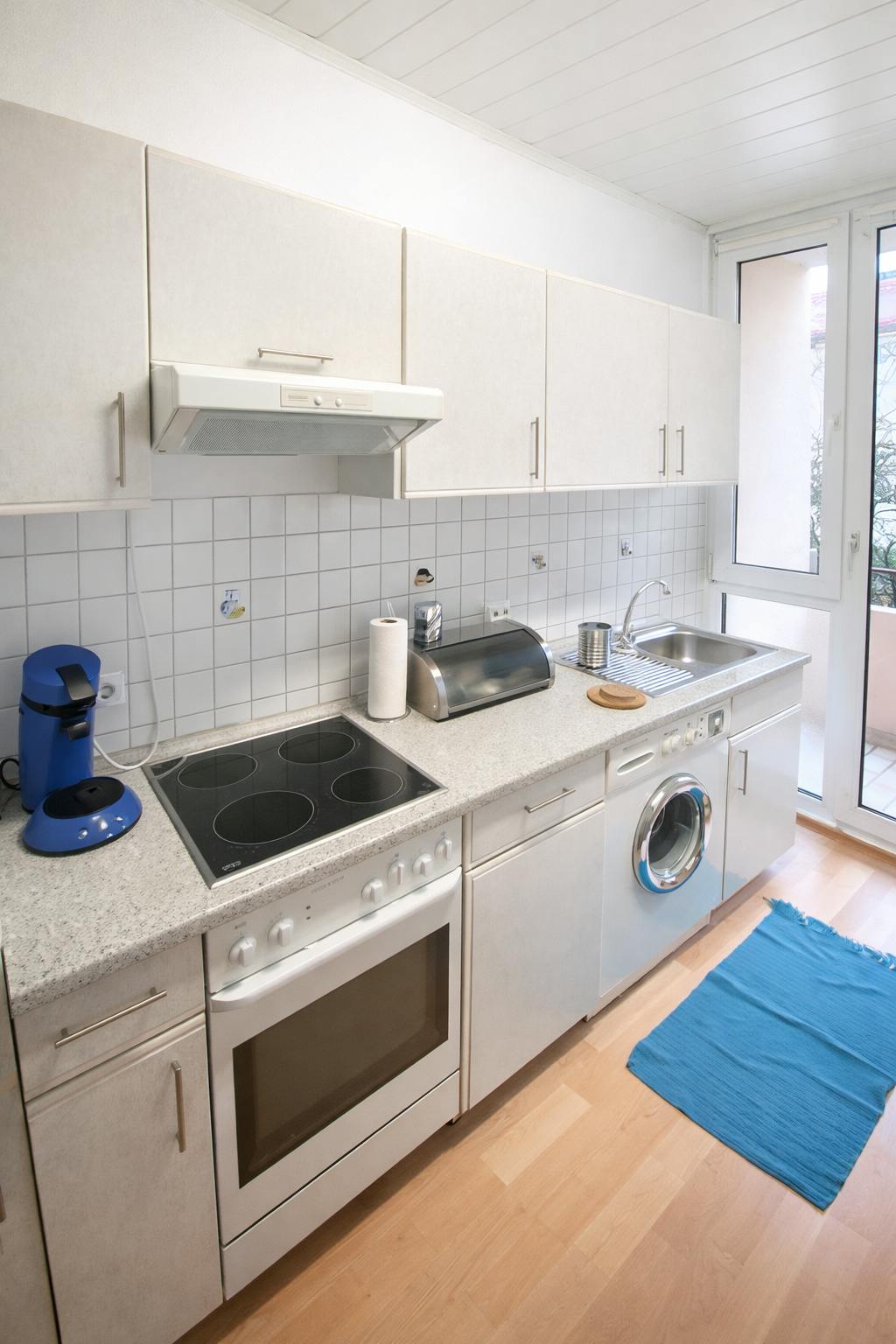 The apartment includes a well-maintained shared bathroom and a separate toilet. The kitchen is fully equipped with essential appliances, including a stove, oven, refrigerator, and microwave, making it easy to prepare meals. Additionally, a washing machine is available for communal use, adding to the convenience of daily living.