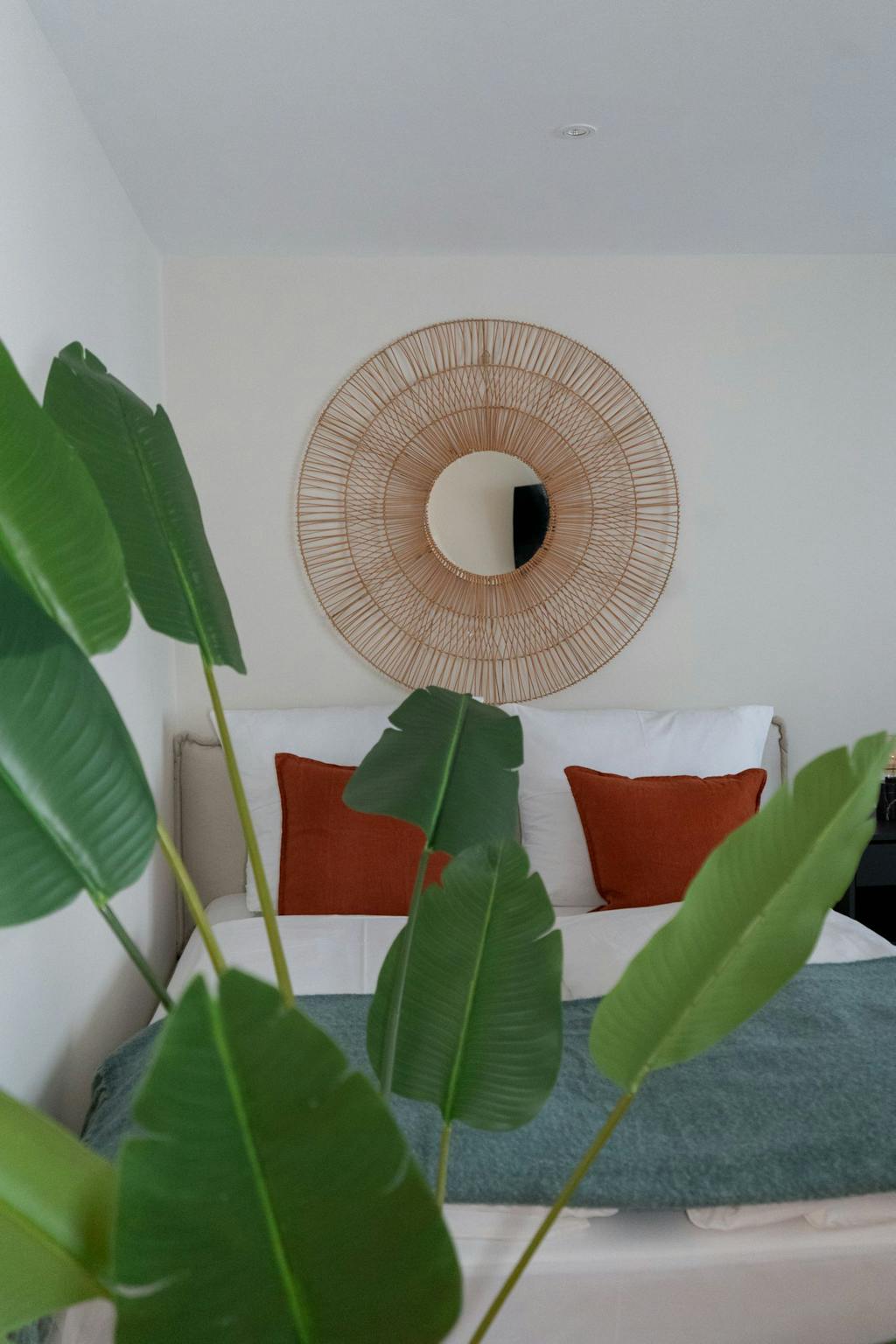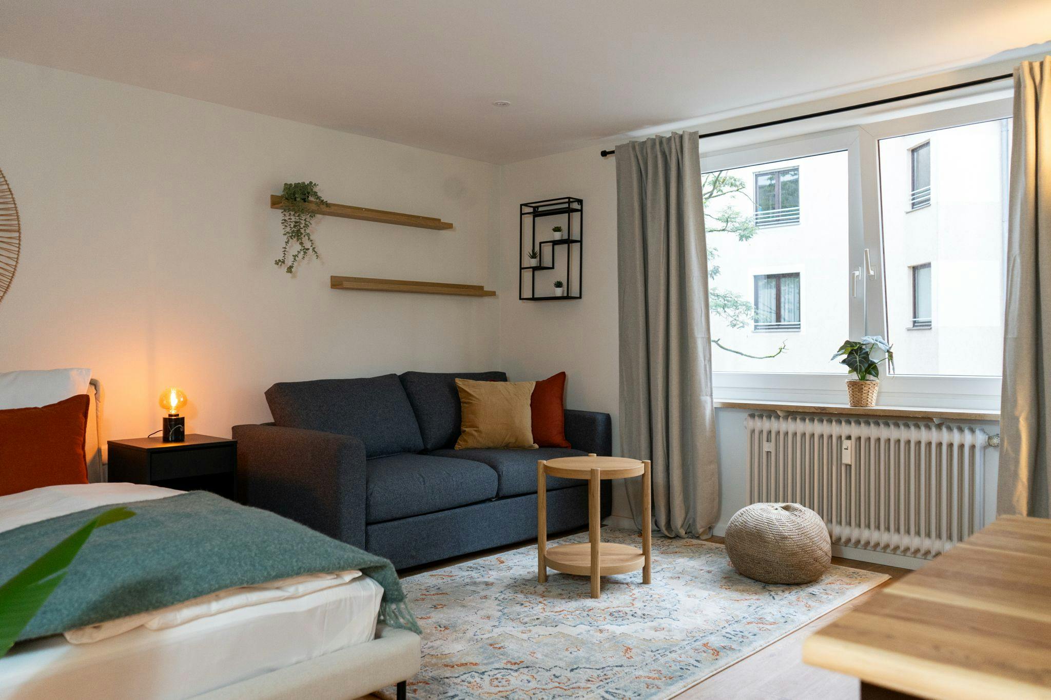 *a beautifully designed living and sleeping area with soft lighting, a comfortable bed, and inviting textiles that create a warm and relaxing atmosphere;