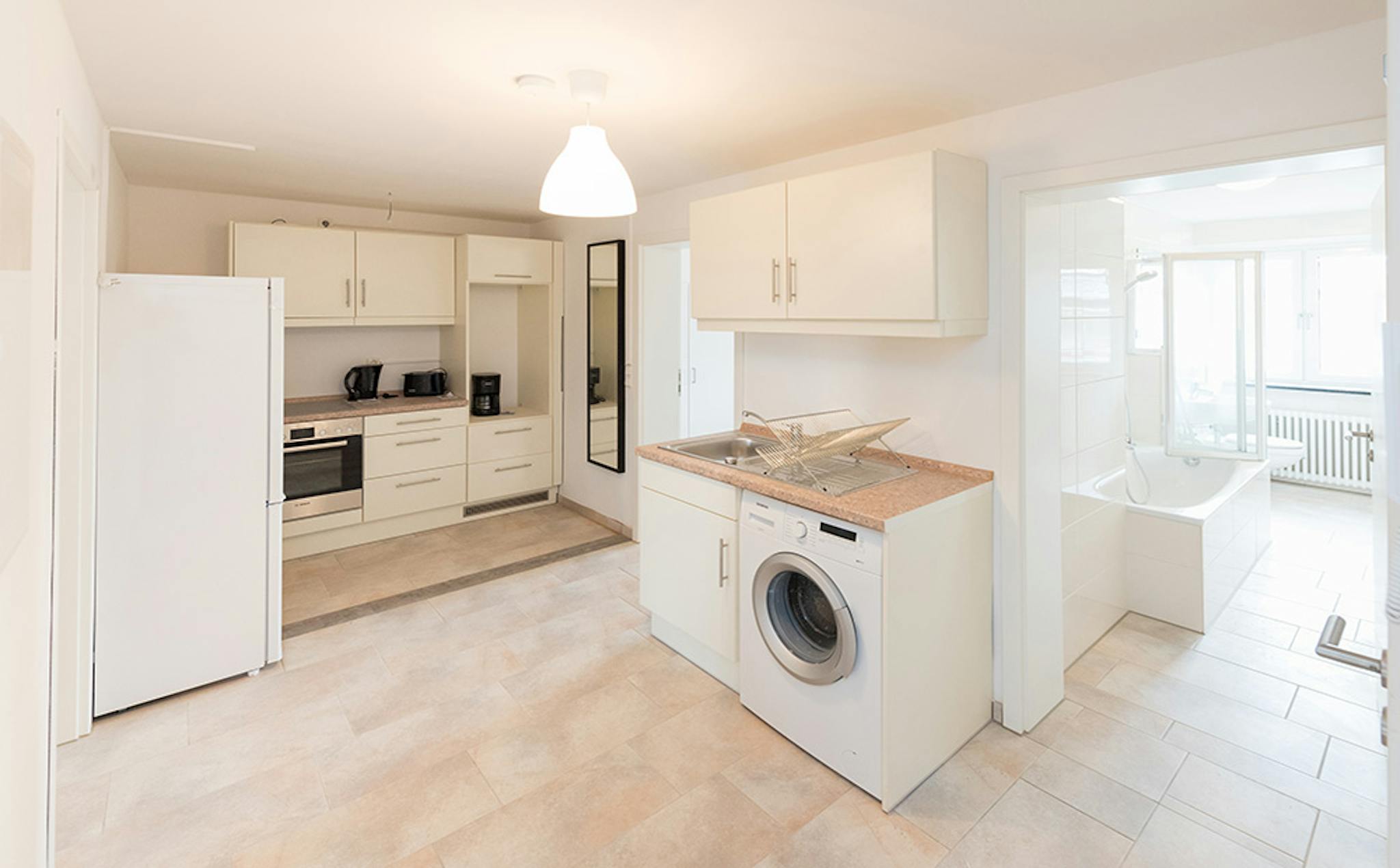 Our flats fulfil all your daily living requirements. Every flat comes readily equipped with a kitchen, including refrigerator, cooking equipment and dishes. Flats also include a washing machine and Wi-Fi Internet. Each room is fully furnished and offers a comfortable bed with fresh linen and a workspace. The area provides you with several shopping opportunities and excellent connections to public transport.
