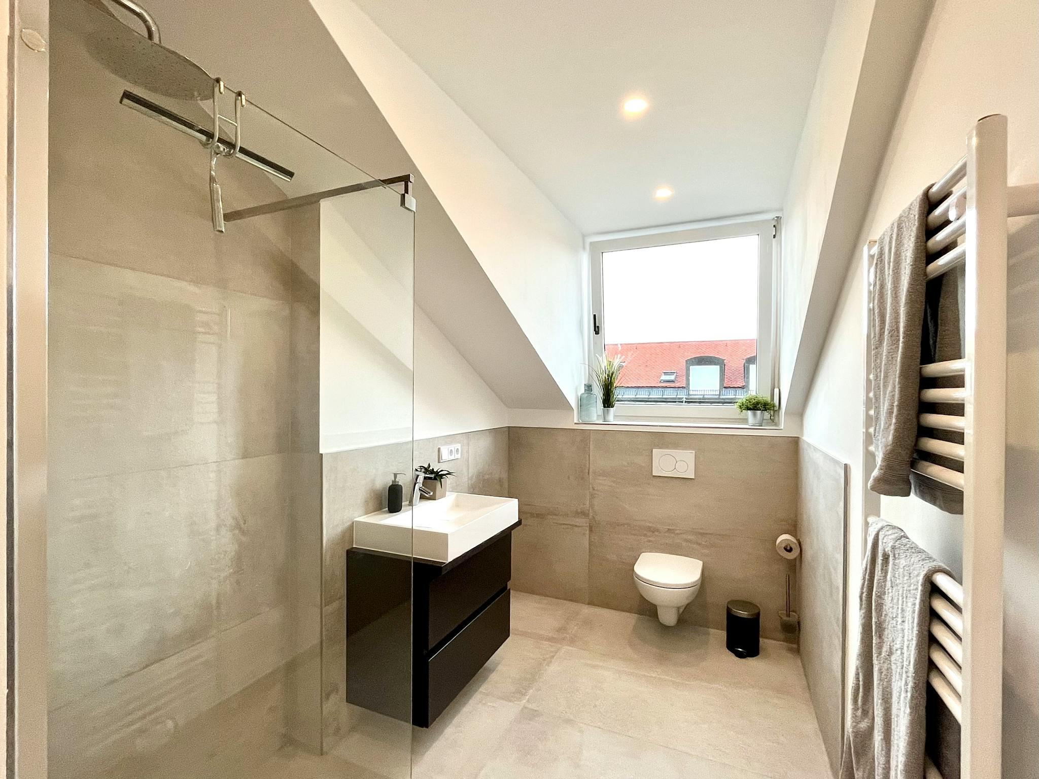 The apartment also has two newly furnished bathrooms, each with a washbasin and LED mirror, a towel radiator and a shower as well as a toilet. We also offer you a washing machine for your convenience.