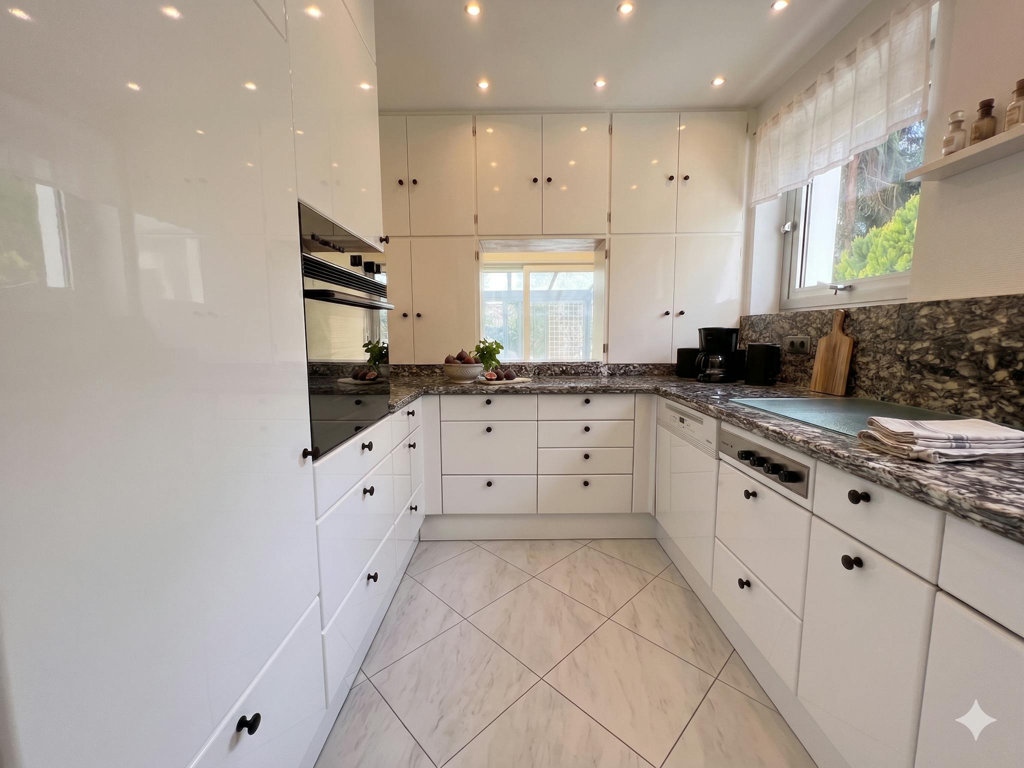 Gemeinschaftsräume: Voll ausgestattete Einbauküche (Spülmaschine, Kaffeemaschine etc.) und ein großzügiger Wohnbereich im Erdgeschoss.
