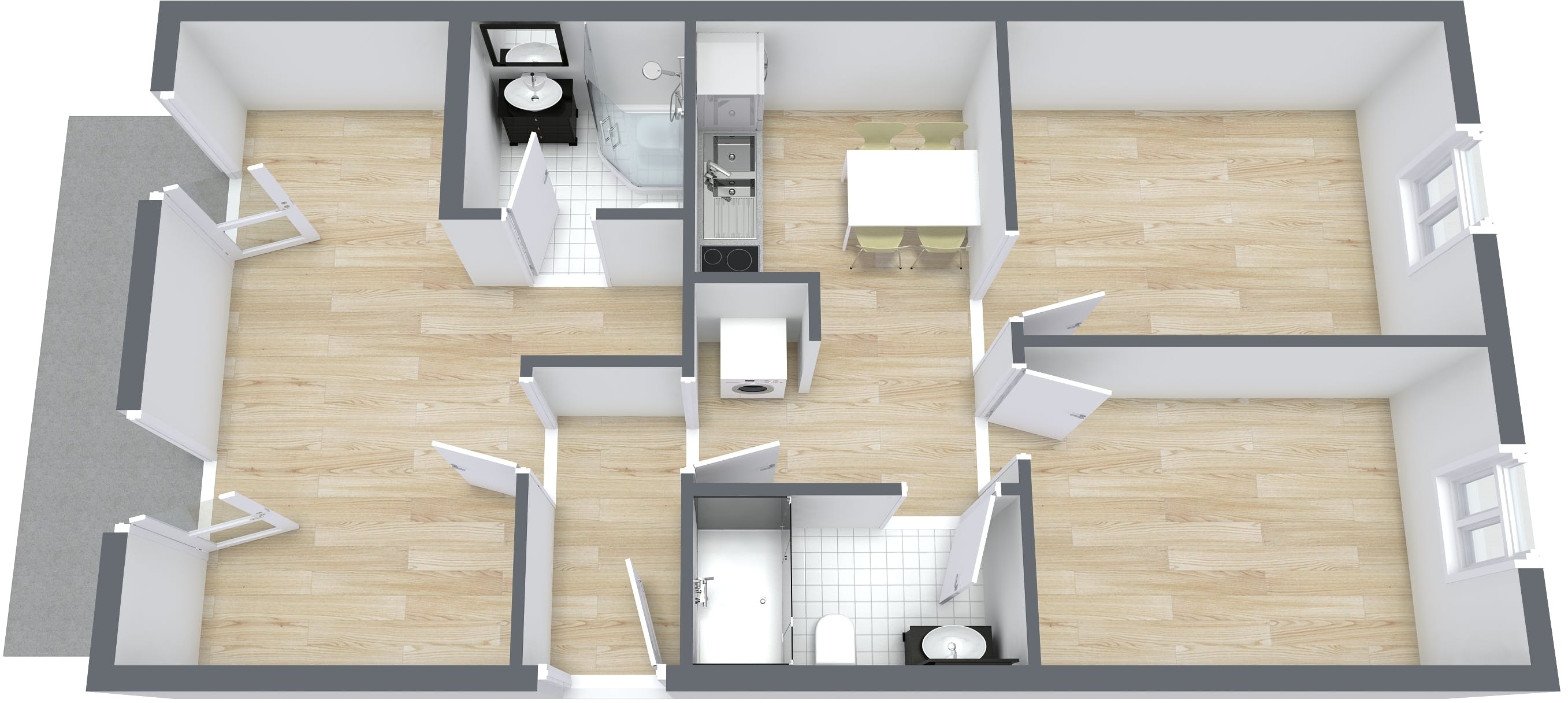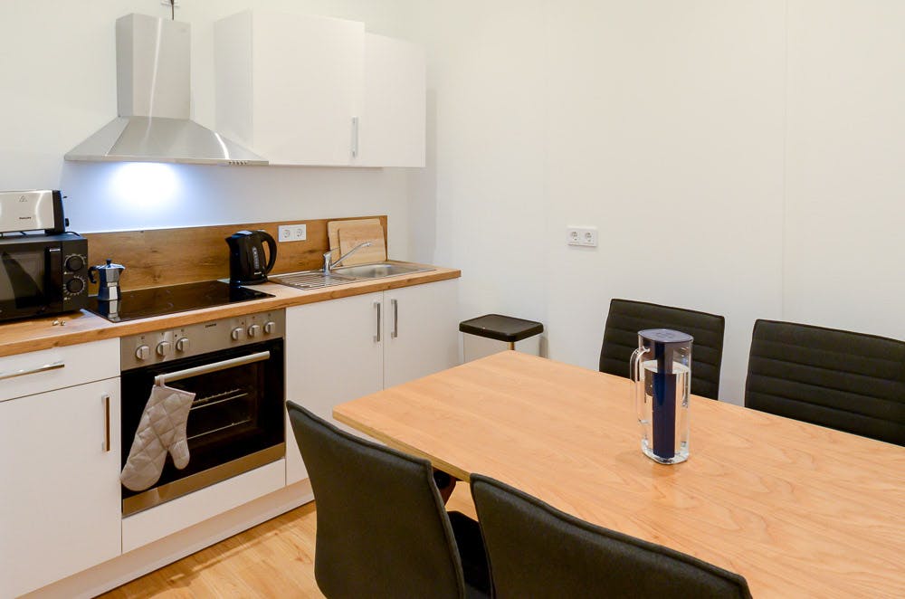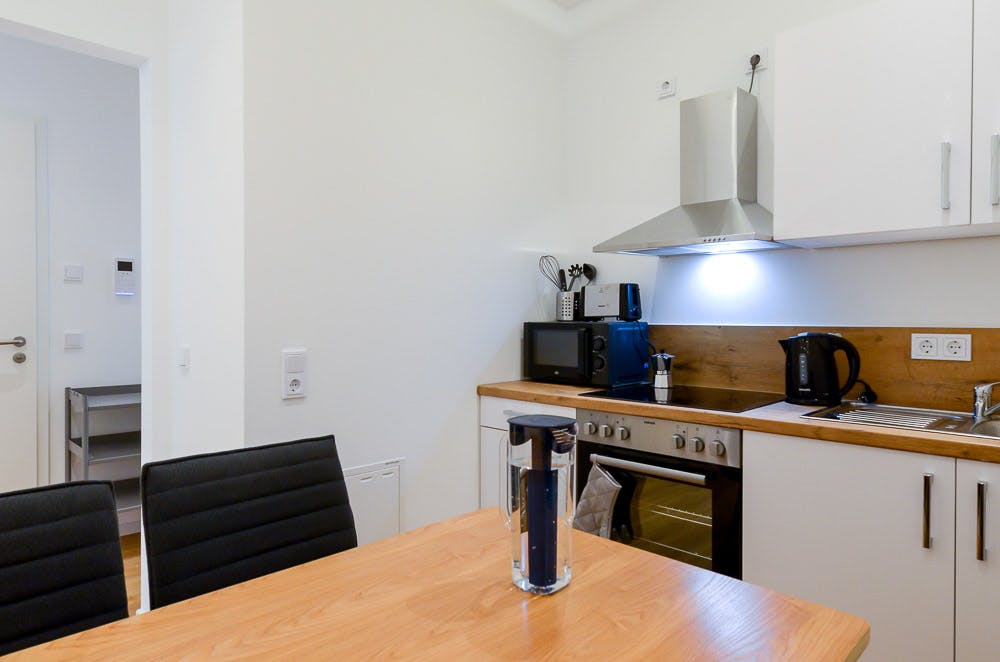 Our flats fulfil all your daily living requirements. Every flat comes readily equipped with a kitchen, including refrigerator, cooking equipment and dishes. Flats also include a washing machine and Wi-Fi Internet. Each room is fully furnished and offers a comfortable bed with fresh linen and a workspace. The area provides you with several shopping opportunities and excellent connections to public transport.