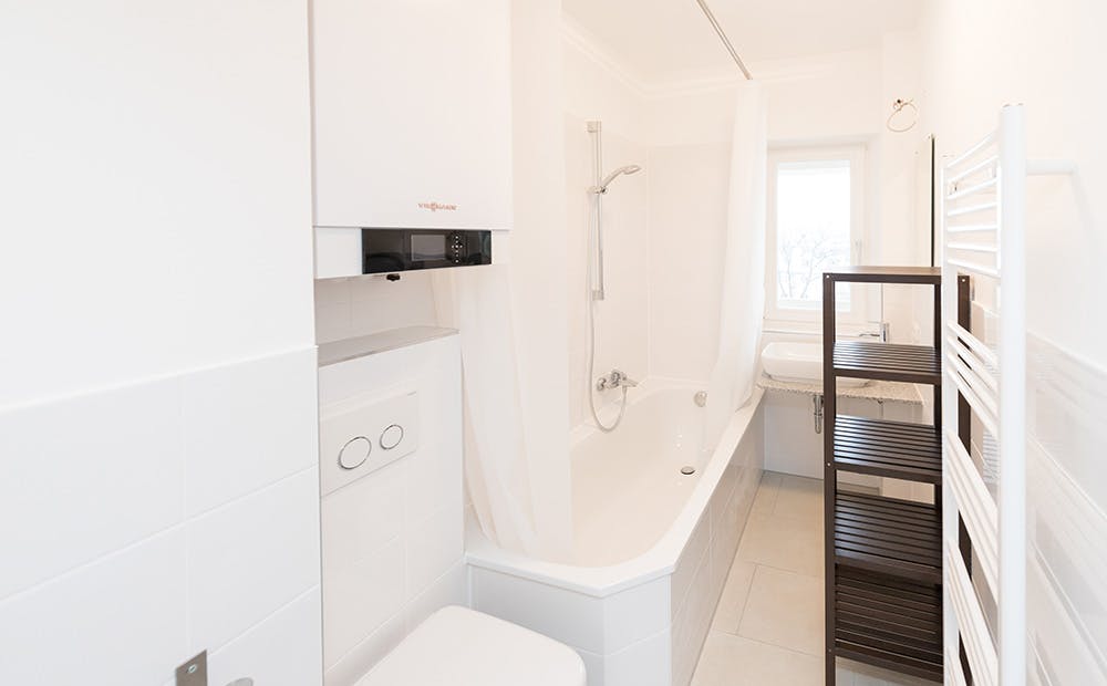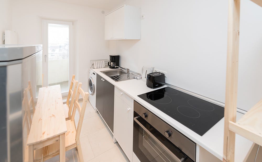 Our flats fulfil all your daily living requirements. Every flat comes readily equipped with a kitchen, including refrigerator, cooking equipment and dishes. Flats also include a washing machine and Wi-Fi Internet. Each room is fully furnished and offers a comfortable bed with fresh linen and a workspace. The area provides you with several shopping opportunities and excellent connections to public transport.