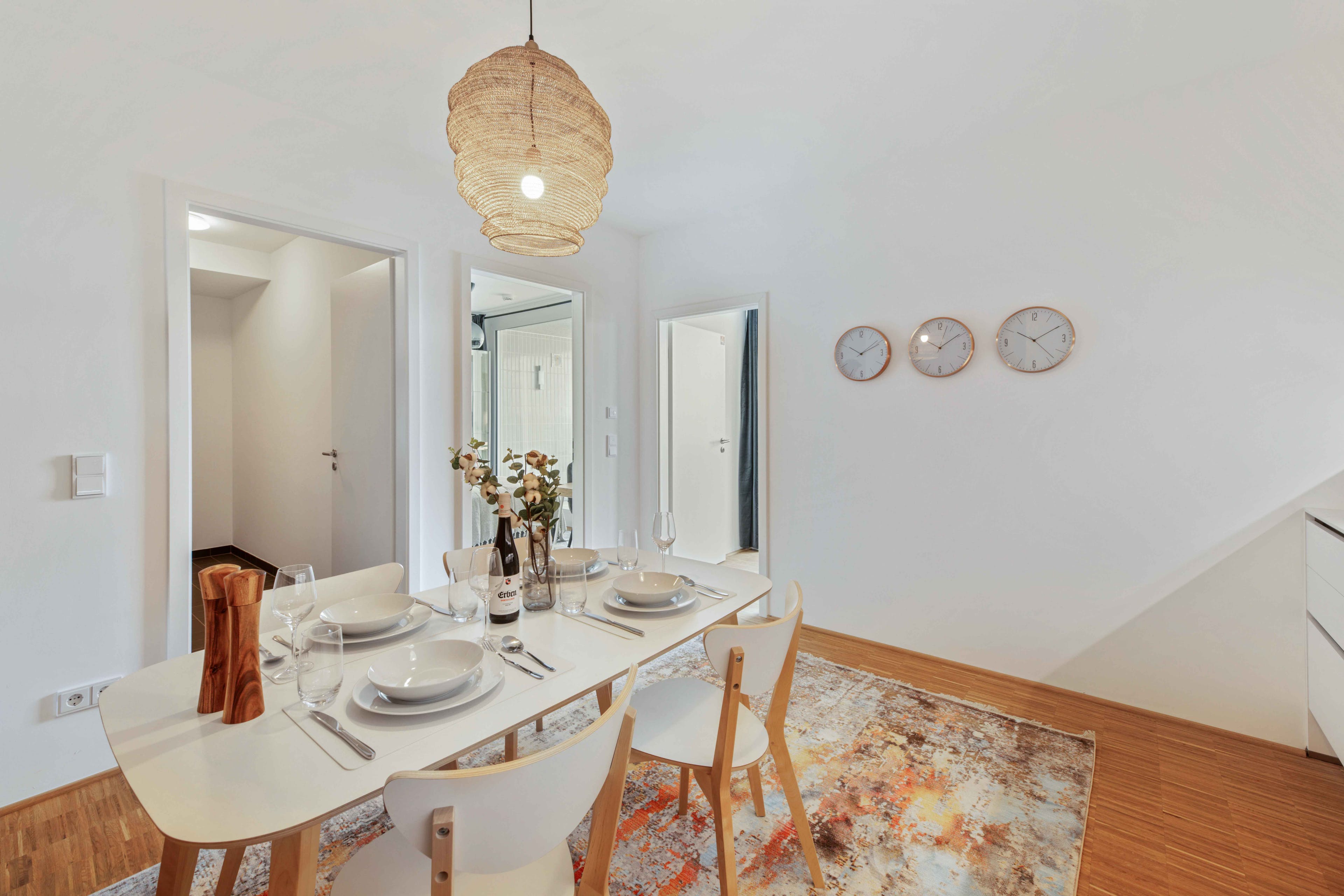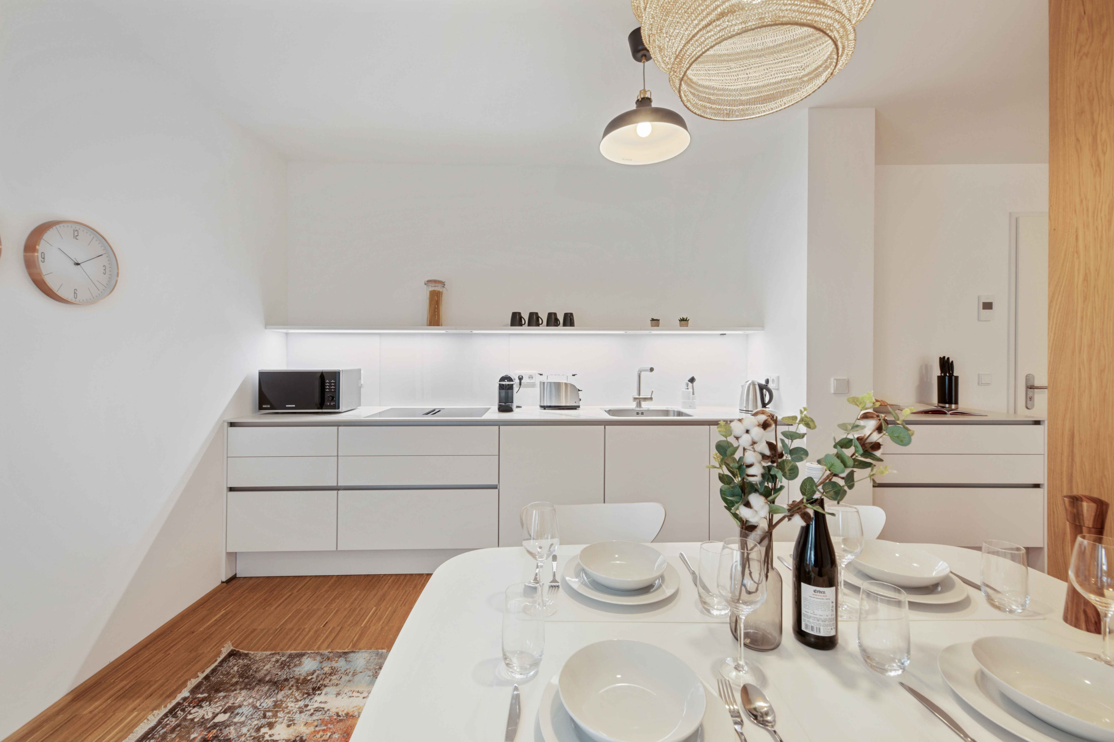 Our flats fulfil all your daily living requirements. Every flat comes readily equipped with a kitchen, including refrigerator, cooking equipment and dishes. Flats also include a washing machine and Wi-Fi Internet. Each room is fully furnished and offers a comfortable bed with fresh linen and a workspace. The area provides you with several shopping opportunities and excellent connections to public transport.