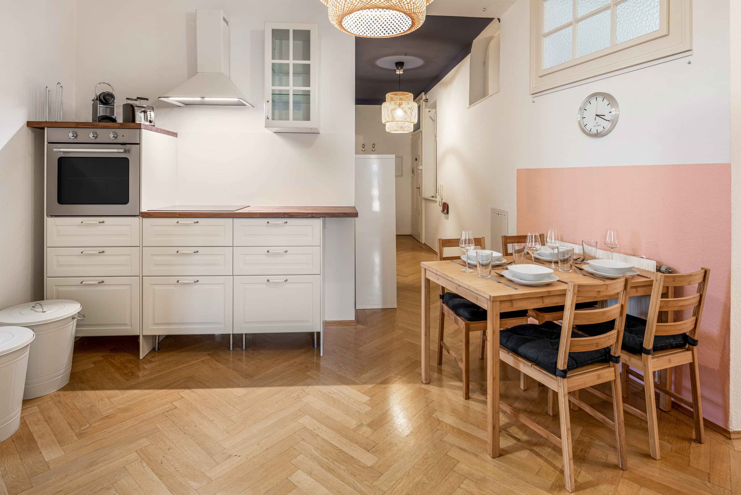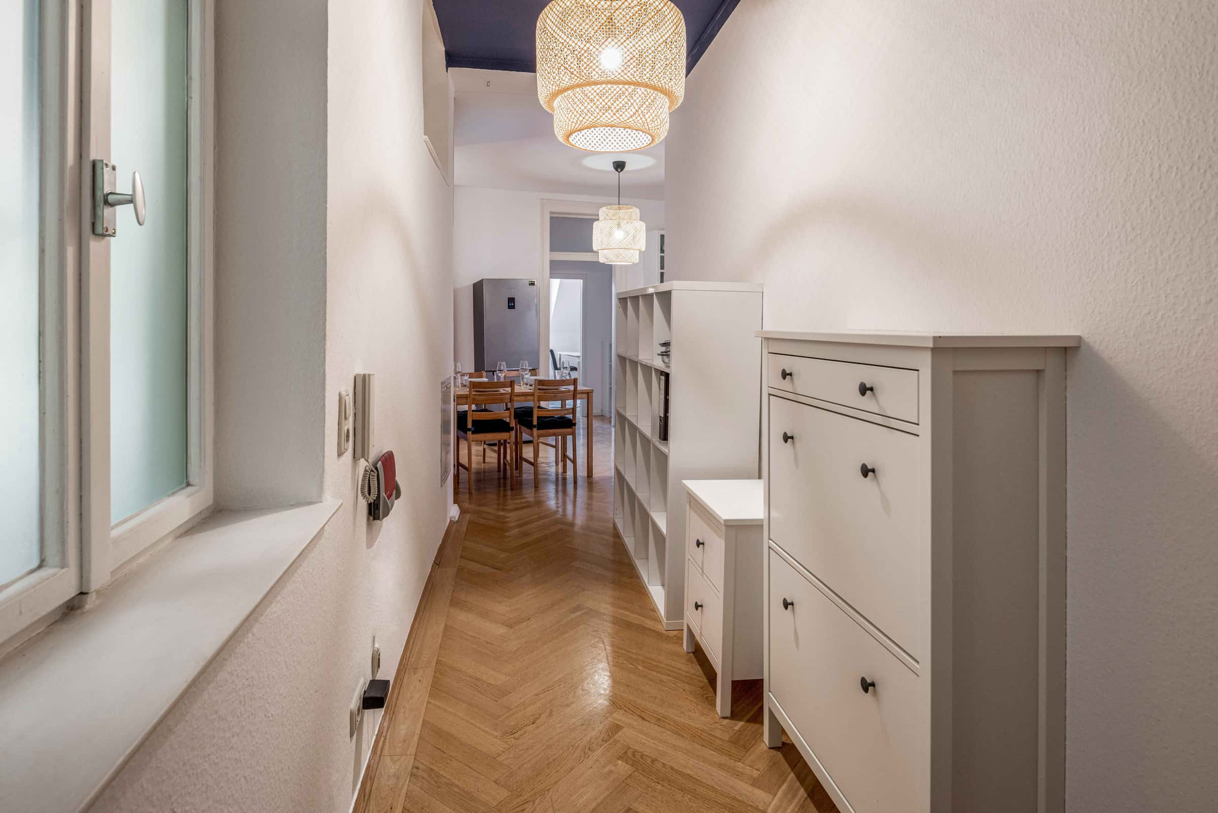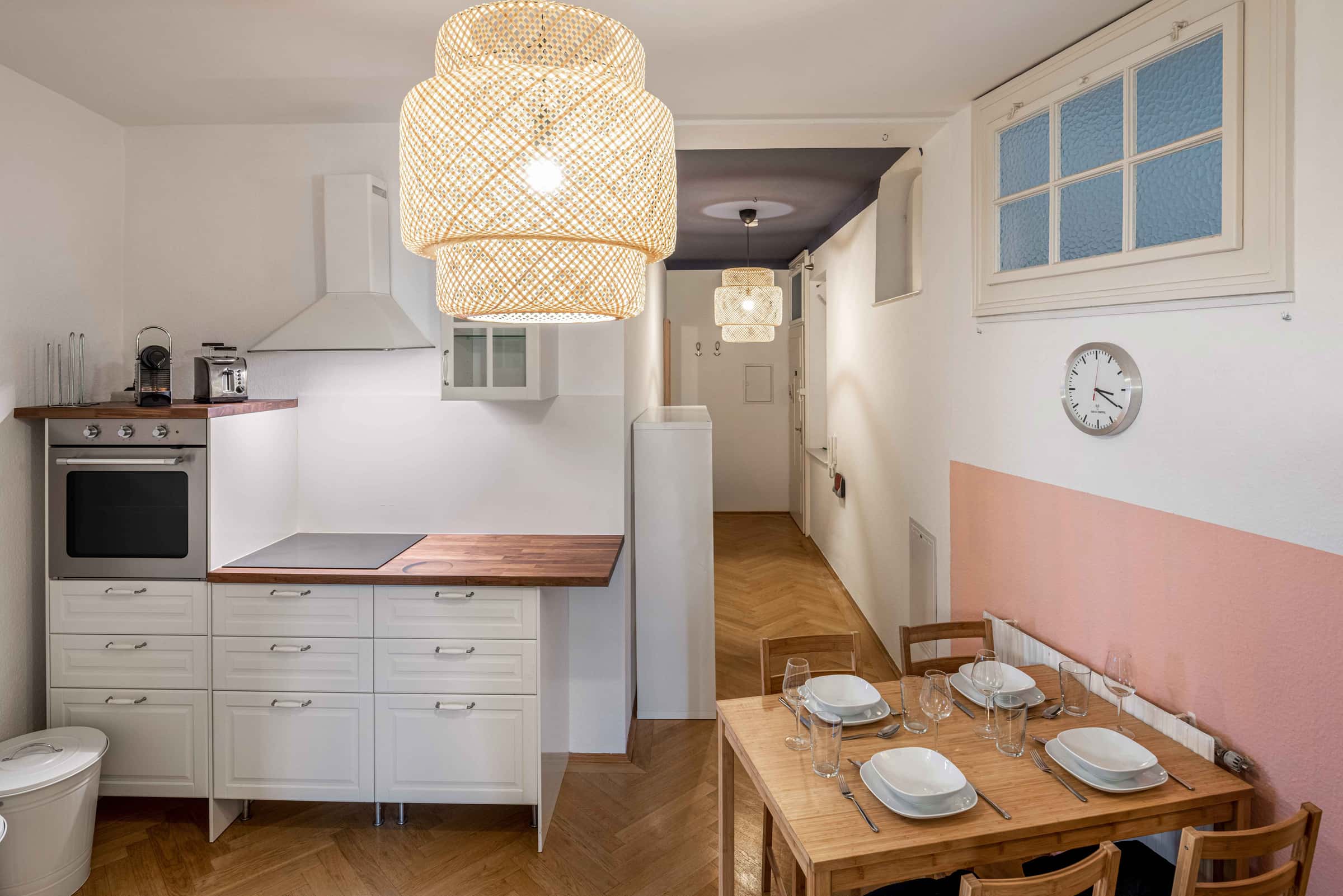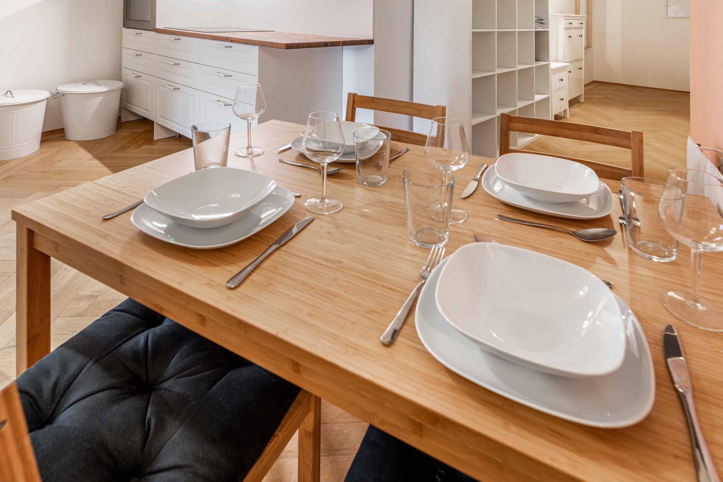 Our flats fulfil all your daily living requirements. Every flat comes readily equipped with a kitchen, including refrigerator, cooking equipment and dishes. Flats also include a washing machine and Wi-Fi Internet. Each room is fully furnished and offers a comfortable bed with fresh linen and a workspace. The area provides you with several shopping opportunities and excellent connections to public transport.
