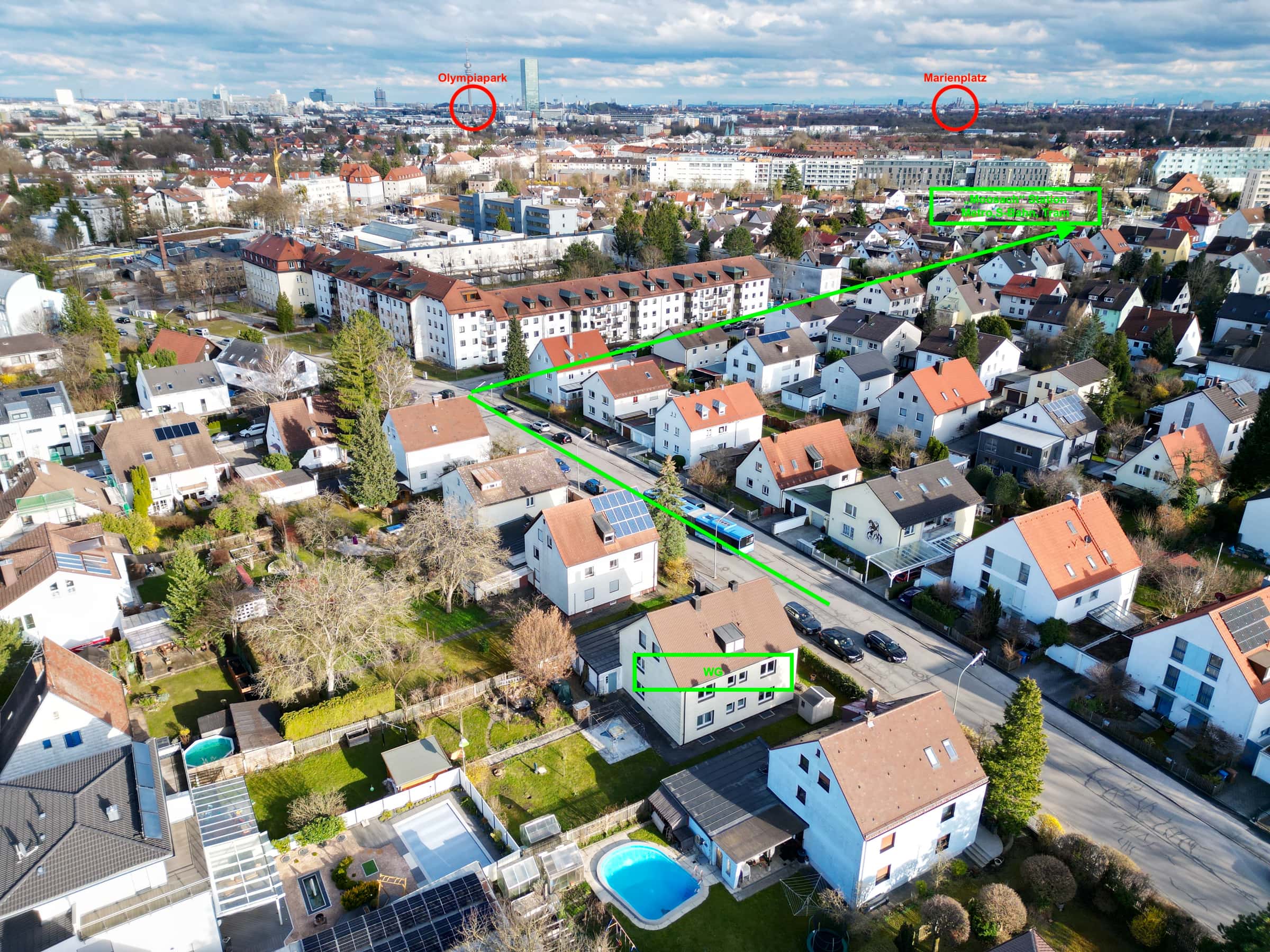 The bus stop is located in front of the door and brings you in 3 minutes to the S-Bahn-, Metro- and Tram- Station "Moosach". You can also go there by foot in 5 minutes. From there you only need 20 minutes to the heart of Munich to Marienplatz.