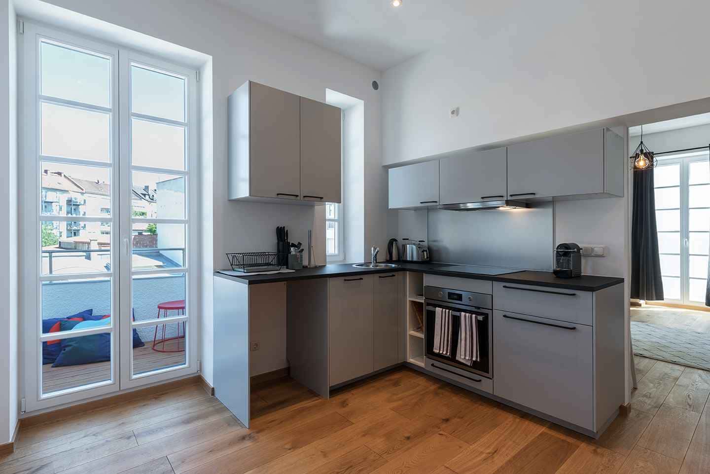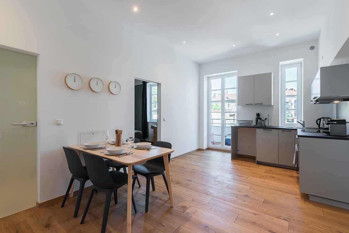 Our flats fulfil all your daily living requirements. Every flat comes readily equipped with a kitchen, including refrigerator, cooking equipment and dishes. Flats also include a washing machine and Wi-Fi Internet. Each room is fully furnished and offers a comfortable bed with fresh linen and a workspace. The area provides you with several shopping opportunities and excellent connections to public transport.