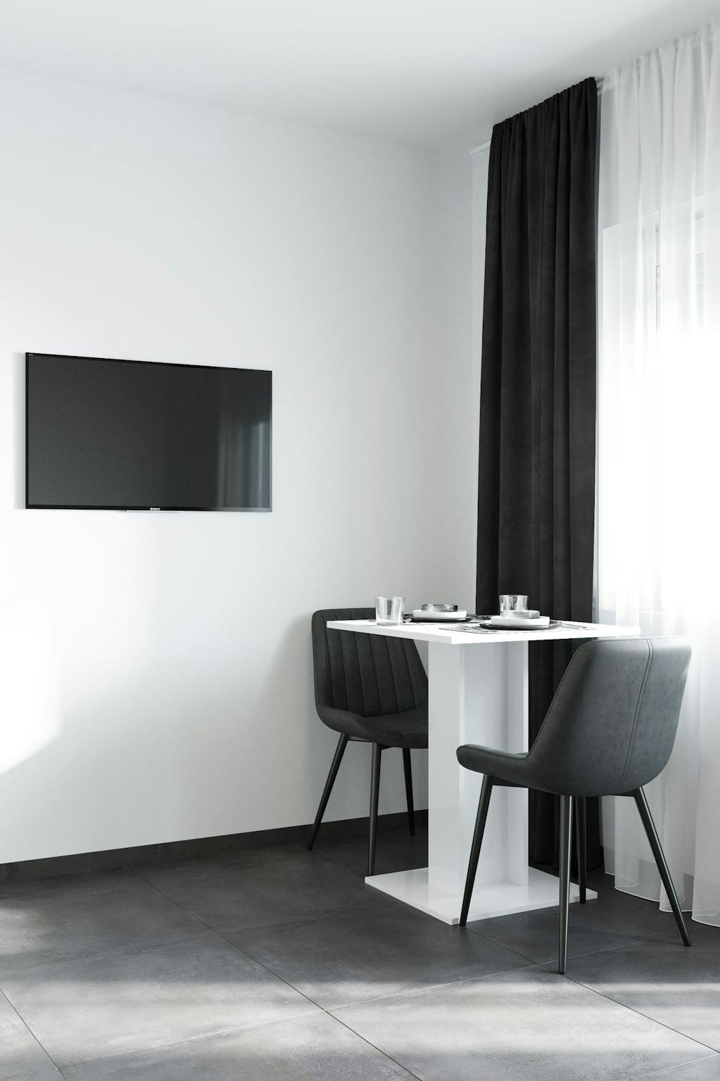 Unsere Wohnungen verfügen außerdem über einen Arbeits-/Esstisch mit Designerstühlen, einen hochwertigen Kleiderschrank und ein luxuriöses Badezimmer mit Handtüchern und Badetüchern. Und für einen zusätzlichen Touch von Eleganz bieten ausgewählte Apartments eine Terrasse oder einen Balkon, von wo aus du atemberaubende Stadtblicke genießen kannst.