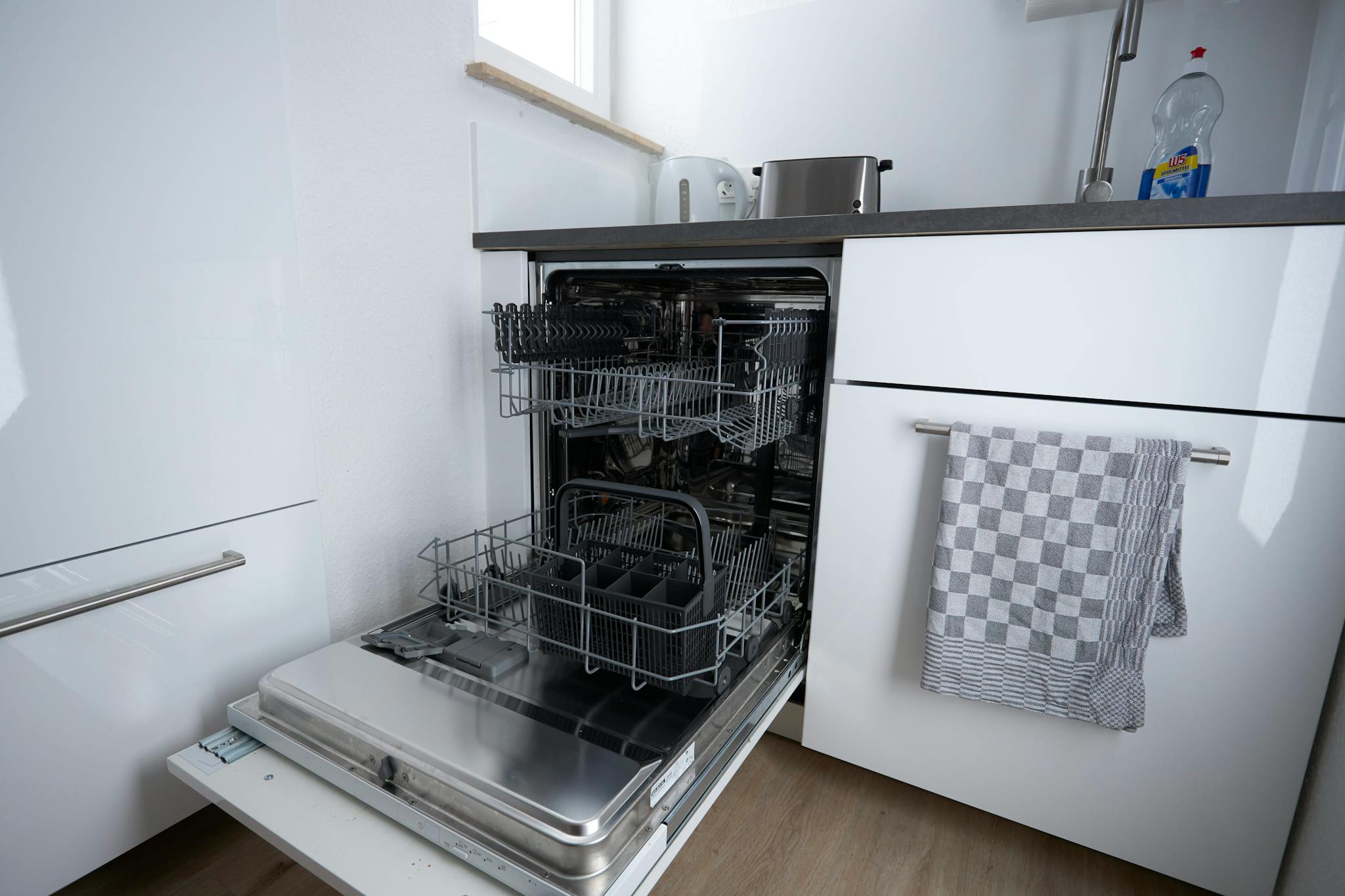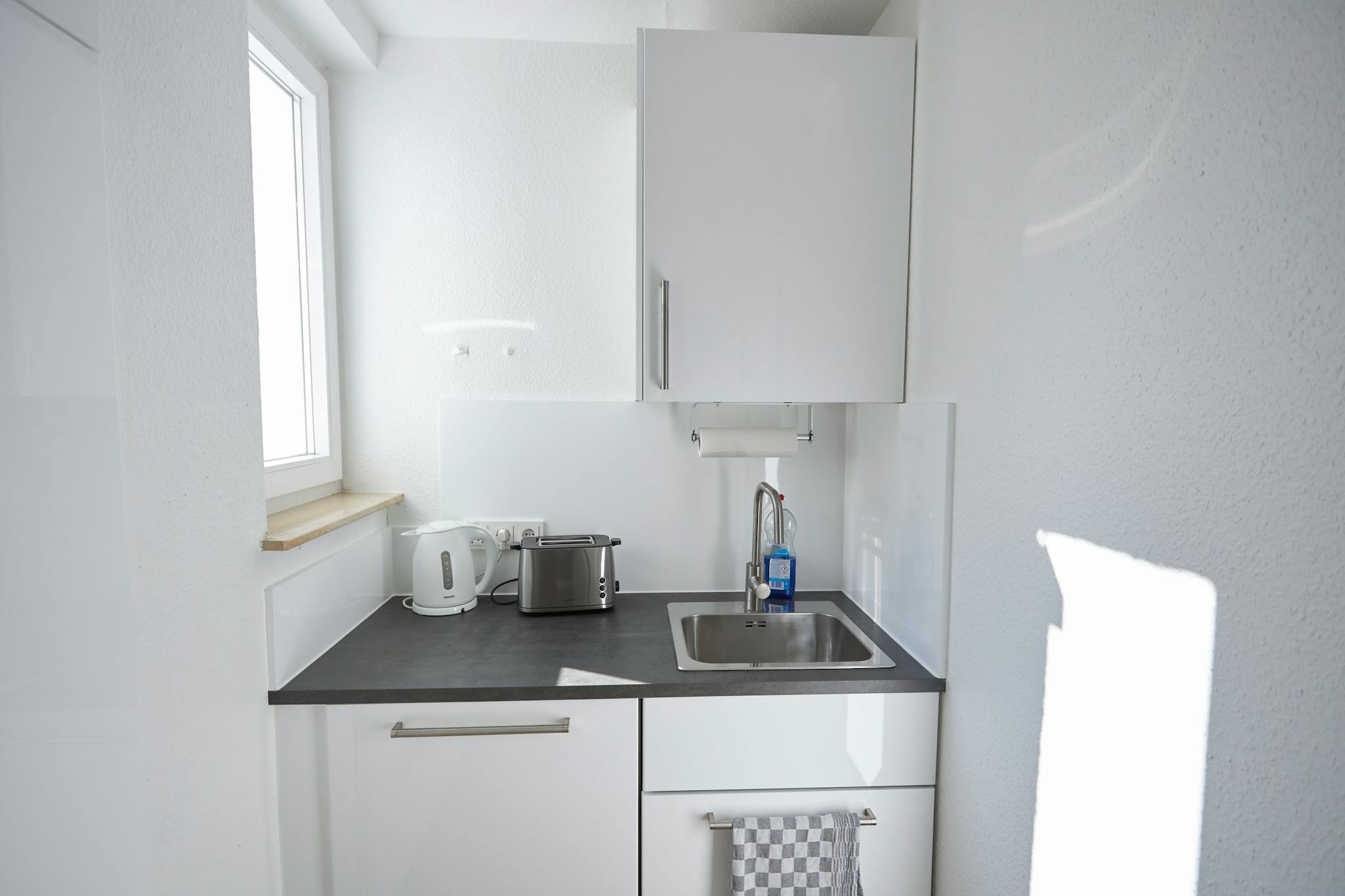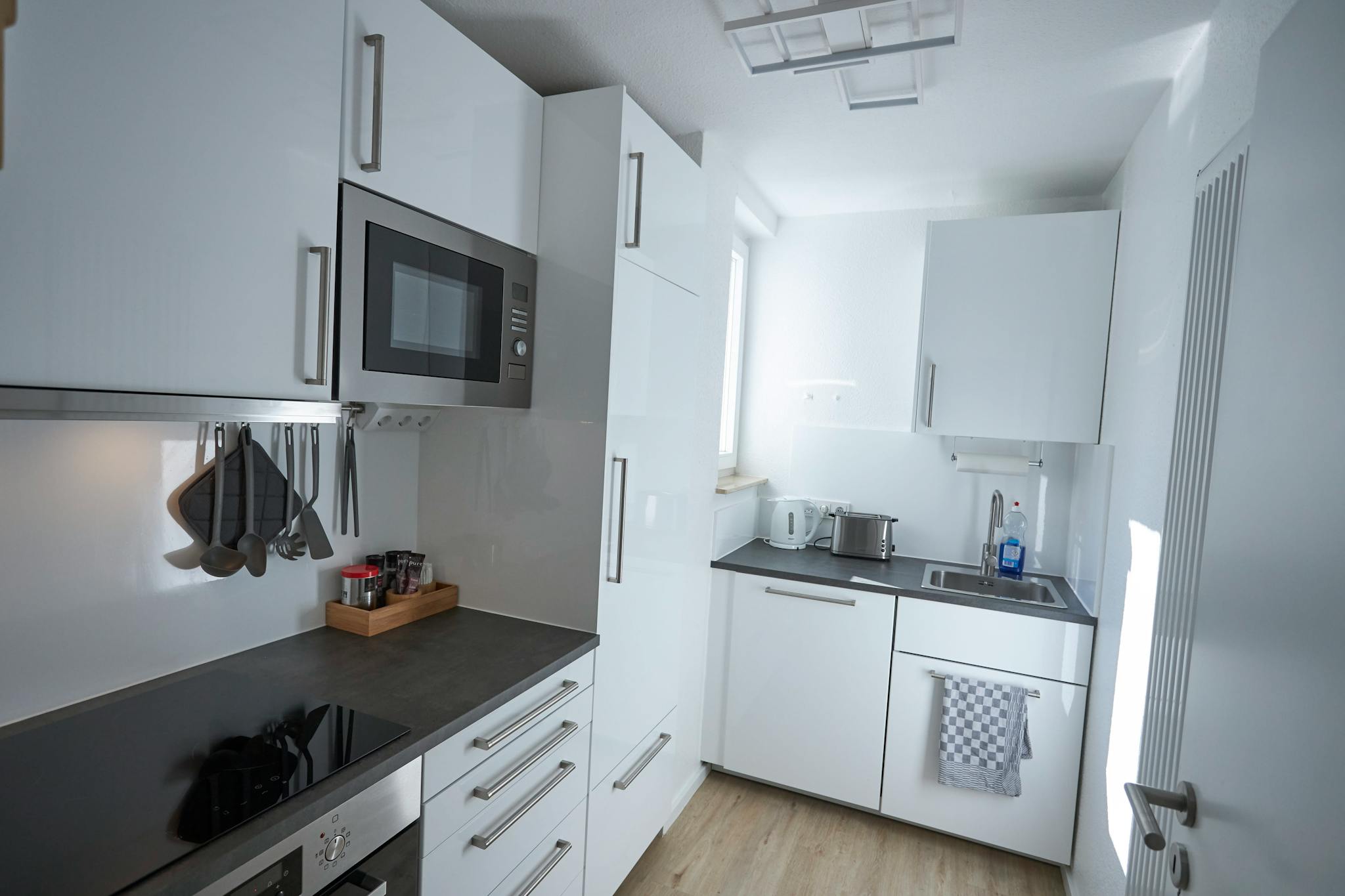 Küche: Voll ausgestattete Einbauküche mit Induktionskochfeld, Mikrowelle, Spülmaschine, Wasserkocher, Toaster und Kaffeemaschine