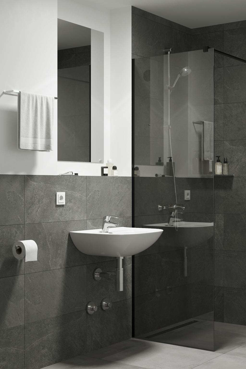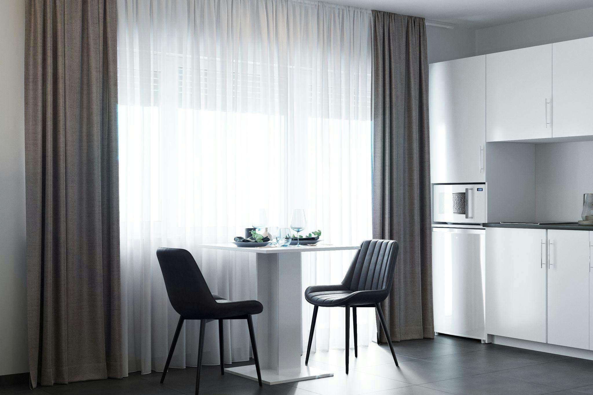Unsere Wohnungen verfügen außerdem über einen Arbeits-/Esstisch mit Designerstühlen, einen hochwertigen Kleiderschrank und ein luxuriöses Badezimmer mit Handtüchern und Badetüchern. Und für einen zusätzlichen Touch von Eleganz bieten ausgewählte Apartments eine Terrasse oder einen Balkon, von wo aus du atemberaubende Stadtblicke genießen kannst.