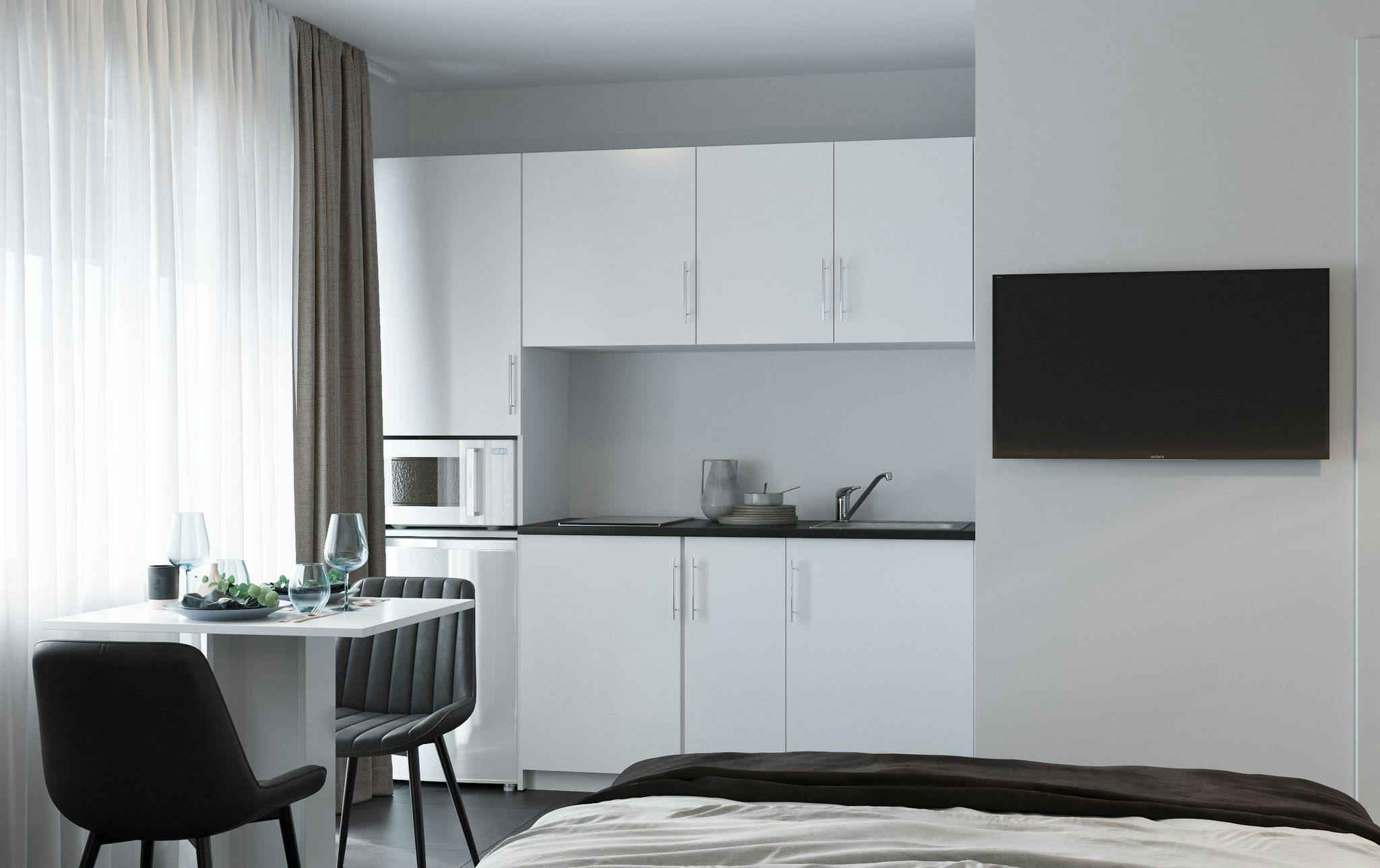 Our apartments also feature a working/dining table with designer chairs, a high-quality closet, and a luxurious bathroom complete with towels and bath towels. And for an extra touch of elegance, select apartments offer a terrace or balcony where you can take in stunning city views.