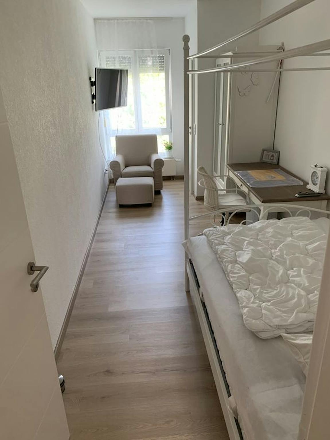 It is the balcony room No.5 with the white steel double bed 120x200.