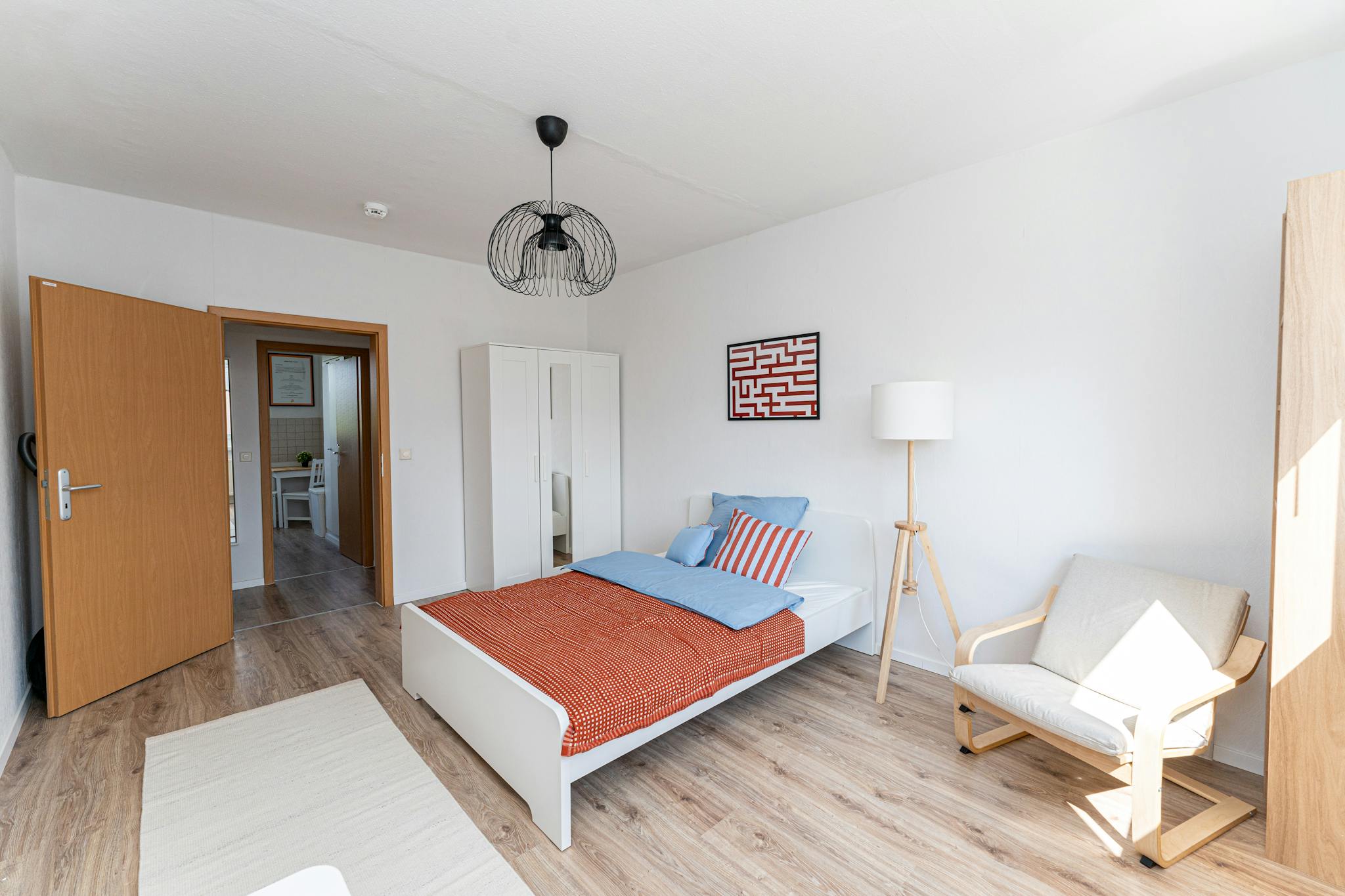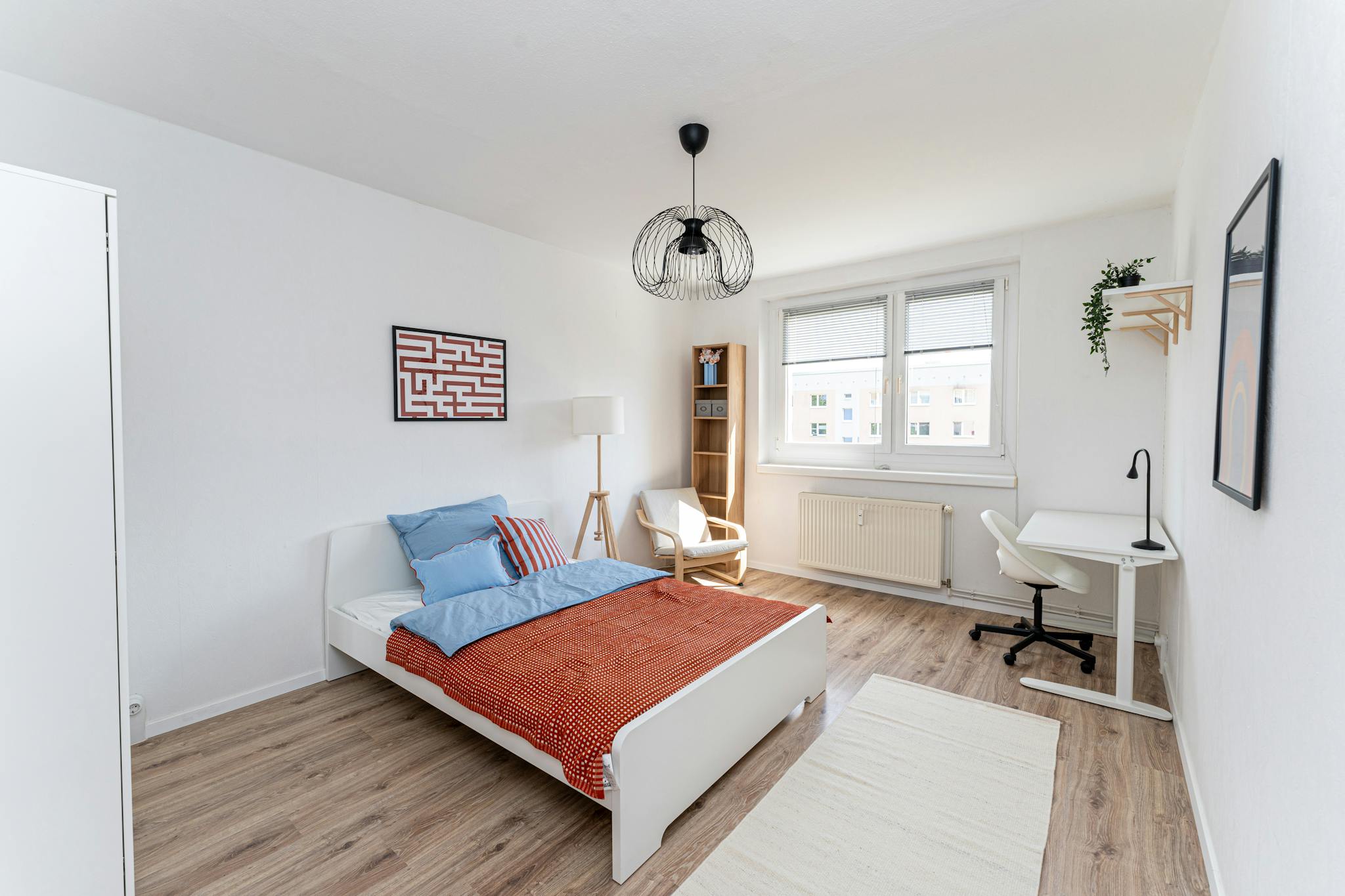 this is a fully furnished room in a shared flat. The room has a comfortable bed, a desk with chair and a wardrobe for your clothes. Also the common areas are fully equipped with washing machine, cooking equipment and all you need for your daily living.