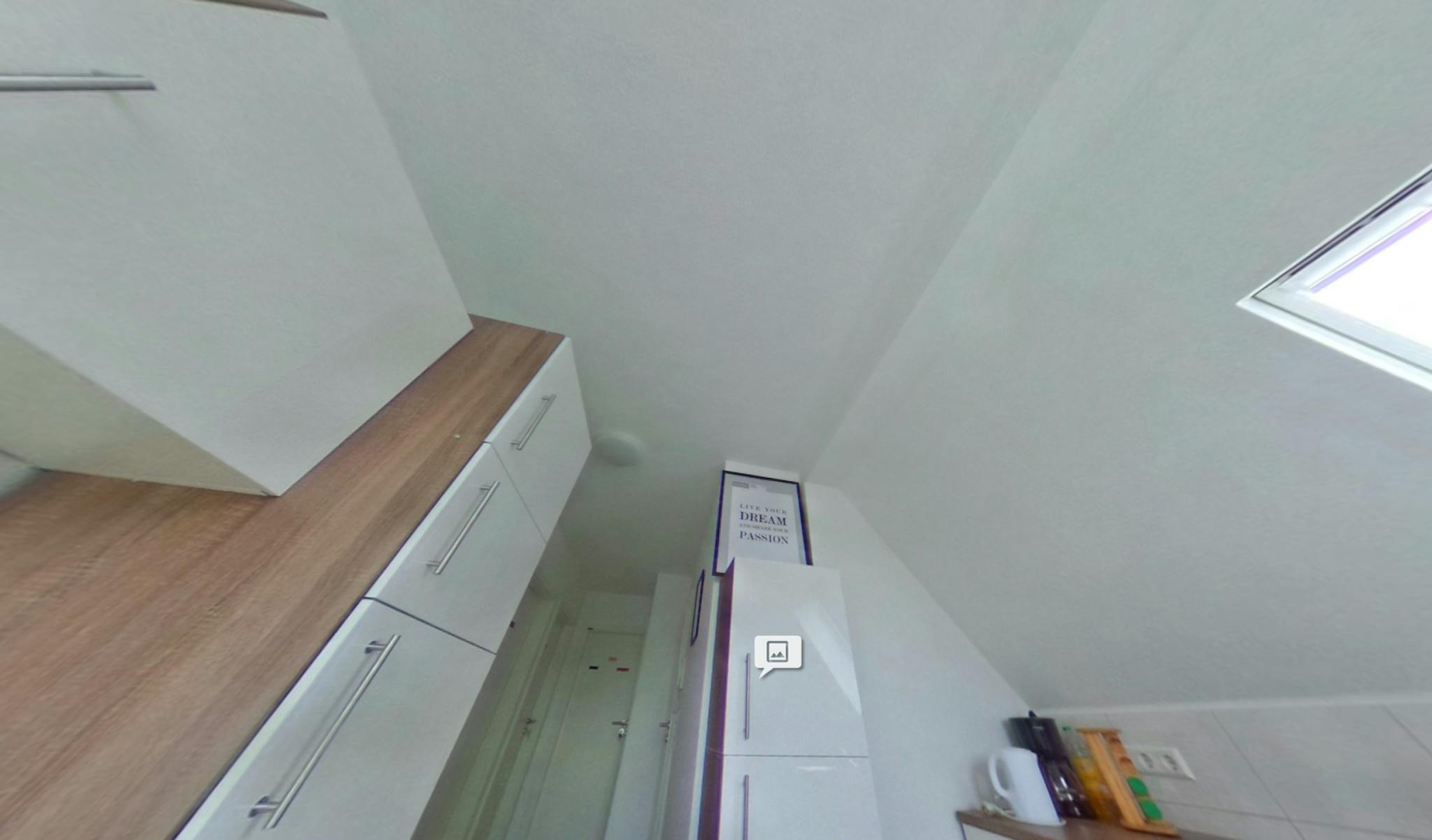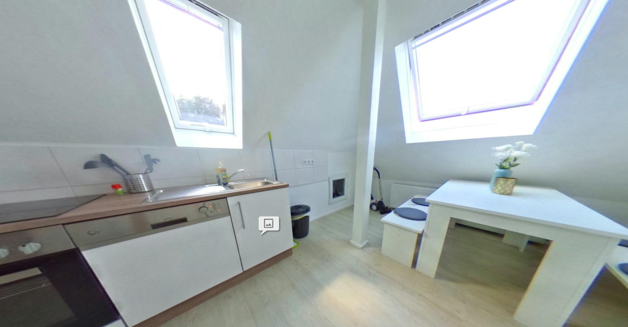 Die voll ausgestattete Küche mit kleinen Essbereich, einem hochwertigen Bad mit Dusche und WC werden in diesem Apartment mit den anderen Mietern geteilt.