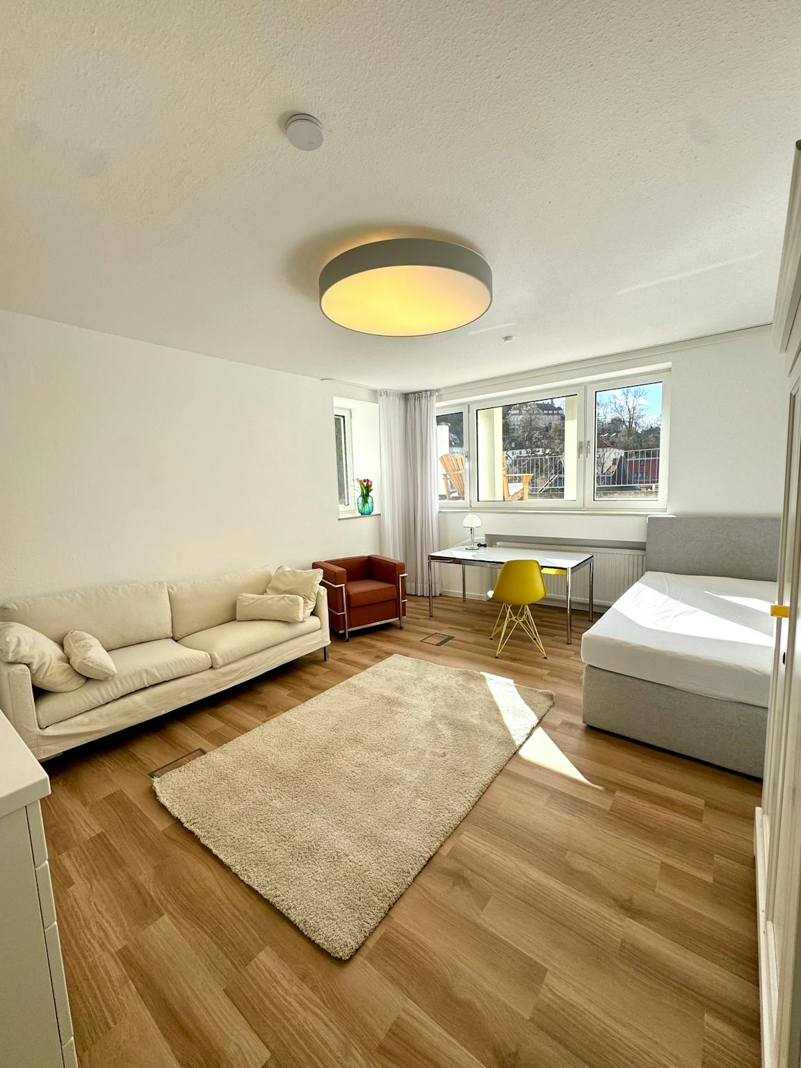 City view, city center within walking distance, excellent light rail connection, resident parking, two separate toilets, one shower room, kitchen, washing machine, dryer, weekly cleaning, built-in wardrobes, sink in each apartment, heavy soundproof doors in each apartment, roller shutters in every room, furnished