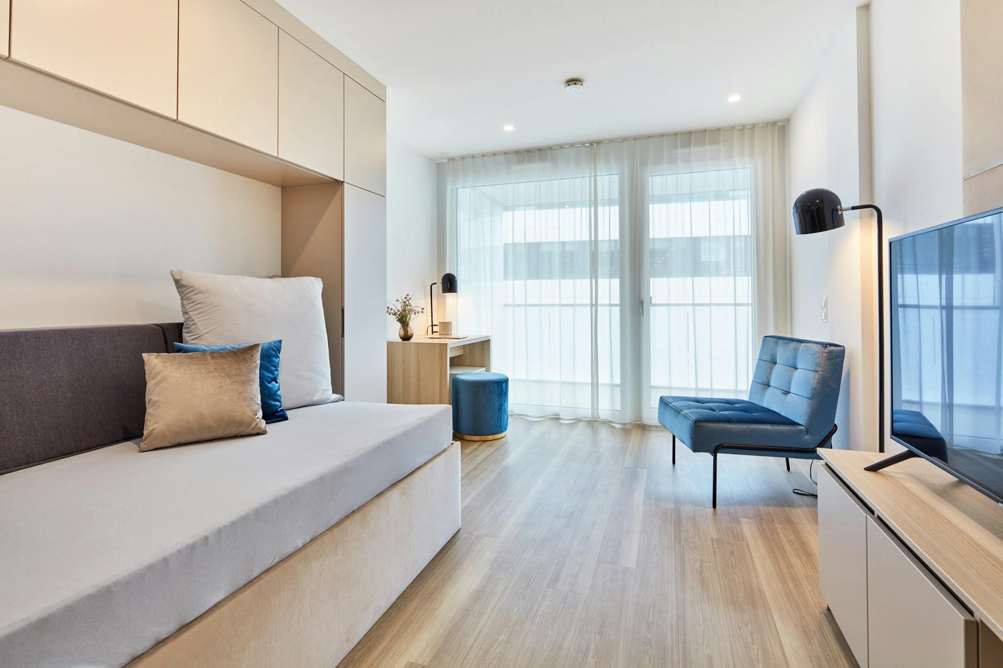 On approx. 35 square metres, the multifunctional full furnishing perfectly organises the individual living areas. Check the latest e-mails at the desk and then relax on the studio sofa, which can be spontaneously transformed into a bed.