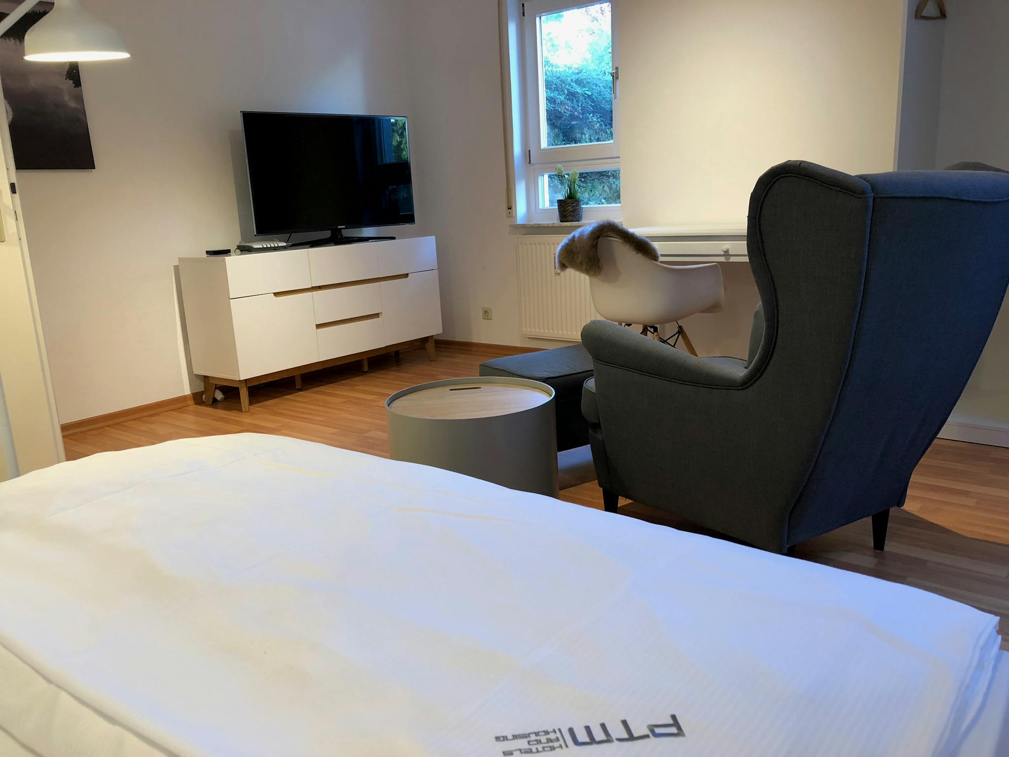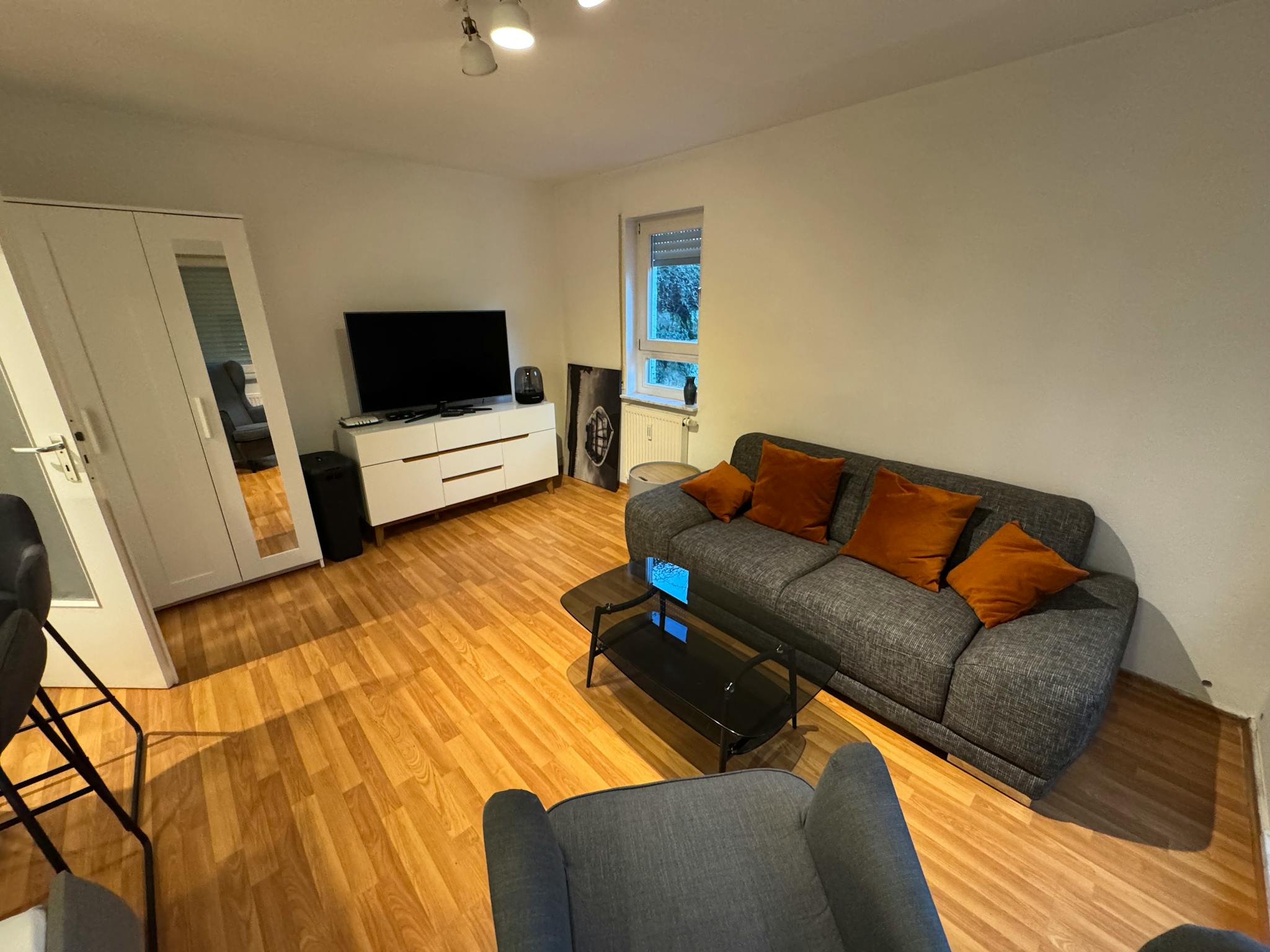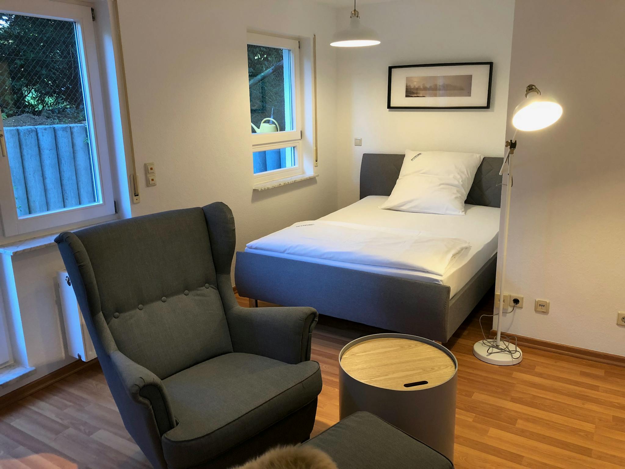 Non-SmokingNot allowedDieses moderne, gemütliche und komplett eingerichtete Studio-Apartment in großartiger Lage ist perfekt für einen langfristigen Aufenthalt. Das lichtdurchflutete Zimmer ist mit einem Boxspringbett und einem Fernseher mit APPLE TV ausgestattet und hat direkten Zugang zur schönen Terrasse und der privaten Garteneinheit. Die Küchenzeile ist mit einem Kühlschrank, einem Herd sowie allen Küchenutensilien und Besteck ausgestattet. Eigerne Waschmaschine und Trockner sind auf der gleichen Ebene außerhalb der Wohnung. Die Wohnung befindet sich in einem gepflegten Mehrfamilienhaus, hat aber einen eigenen Eingang. Ein Kellerraum und ein privater Stellplatz in der Tiefgarage sind inbegriffen.