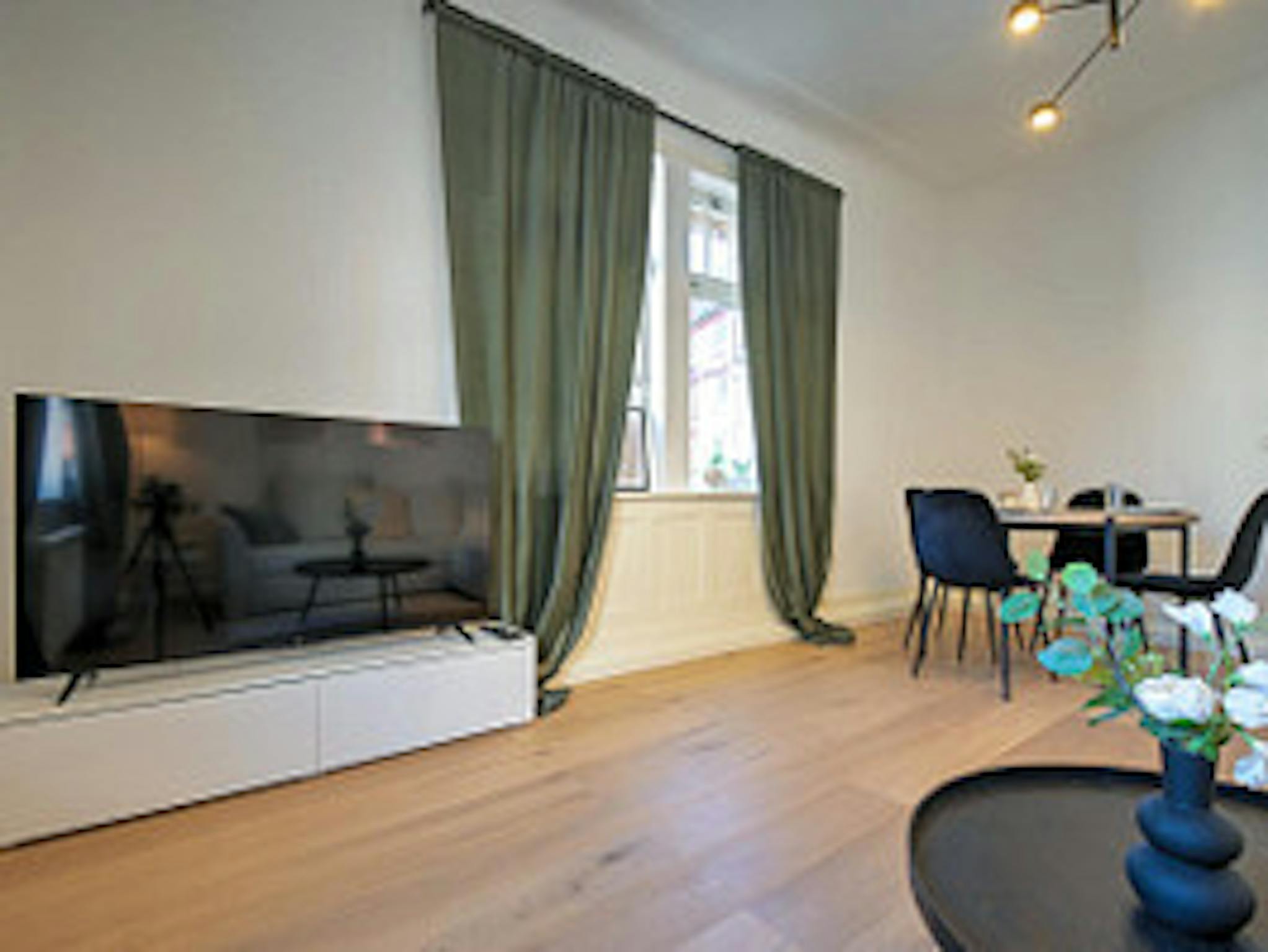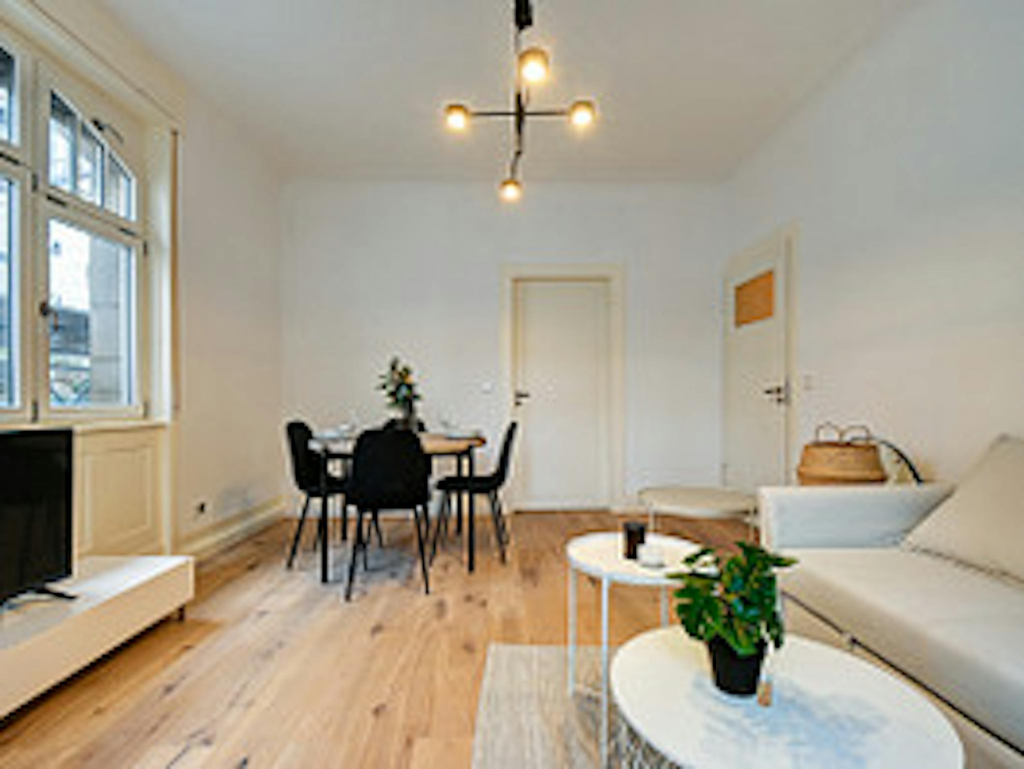 - helles Wohn-/Esszimmer mit Schlafcouch, Sideboard, Smart-TV und rundem Esstisch samt vier bequemen Stühlen
