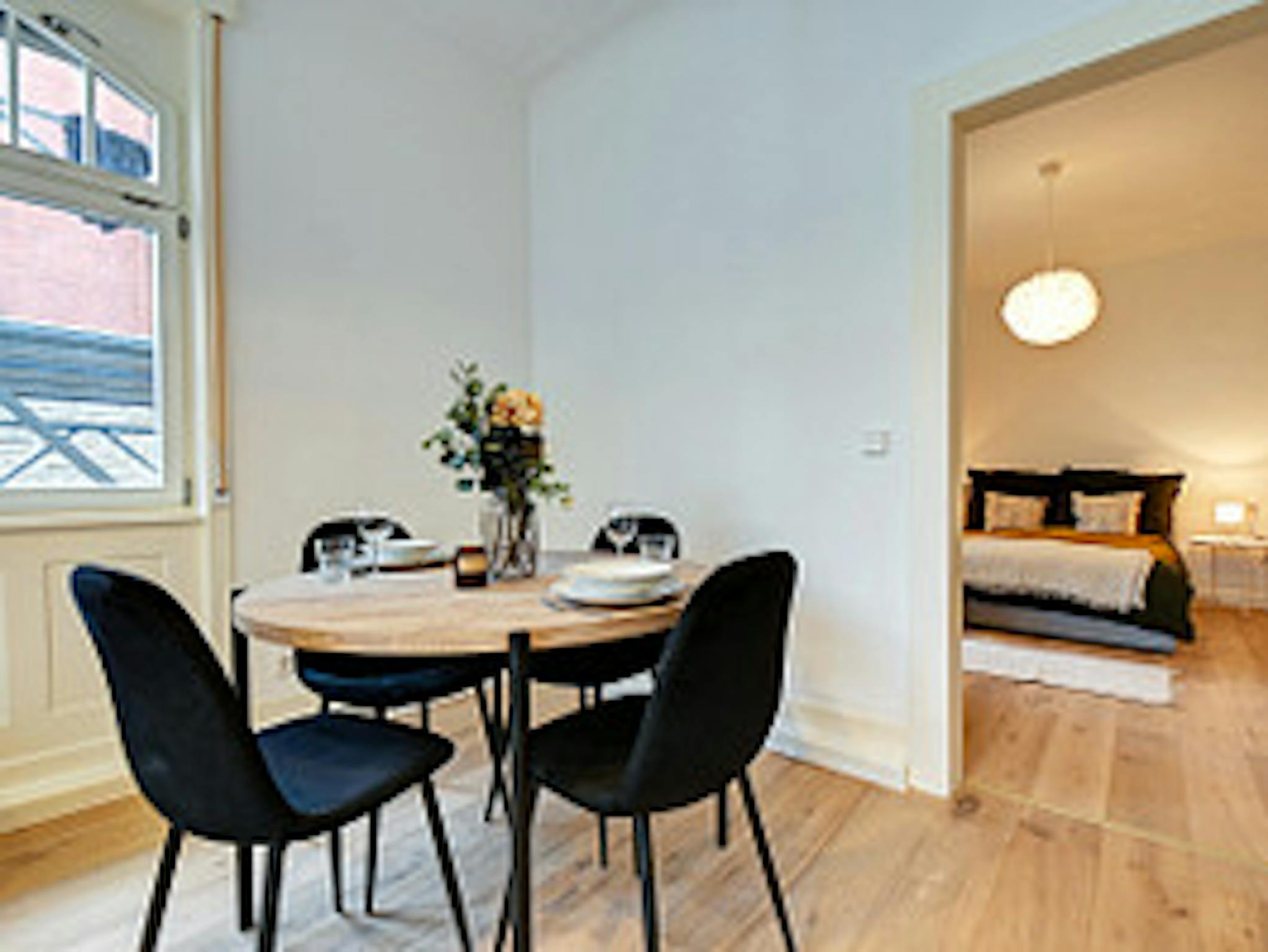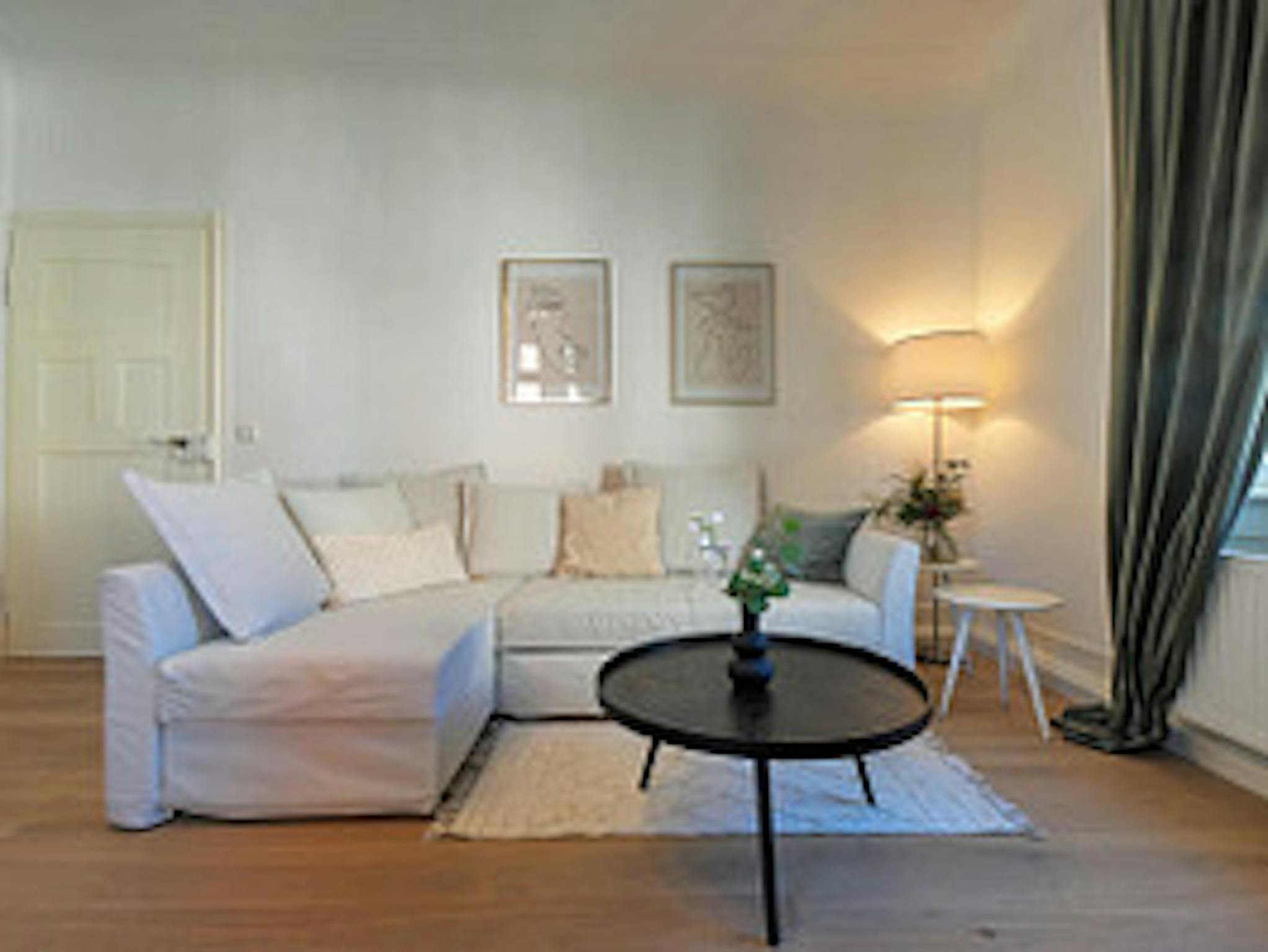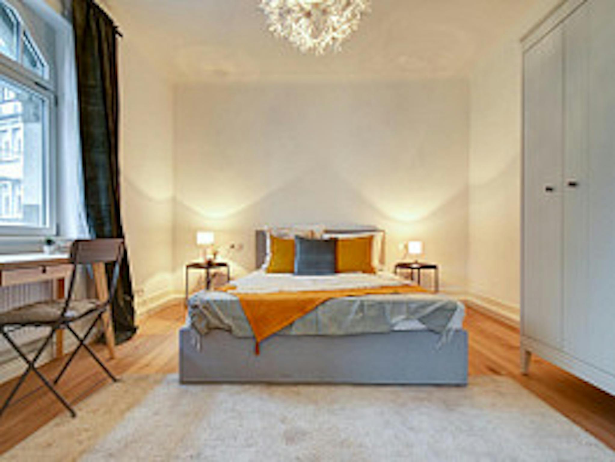 Die Altbautypischen hohen Decken sorgen für extra Wohlfühlflair, ebenso wie die schöne Möblierung, Kissen, Bettwäsche und Deko im Skandi-Style - ein echter Wohlfühlort.