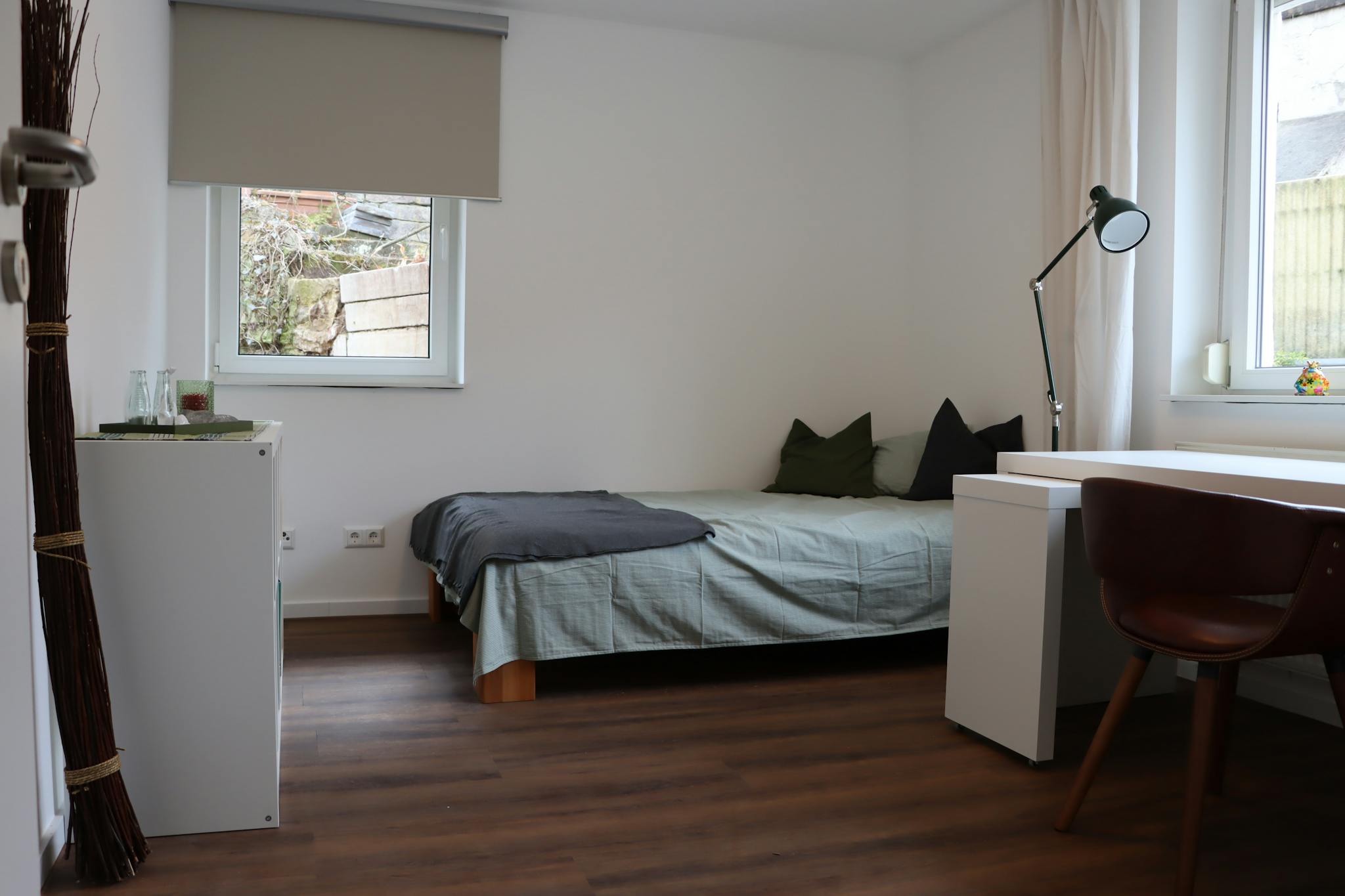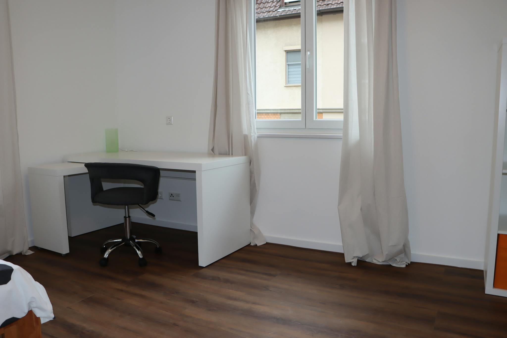 Möblierung Zimmer 4: 120x200 cm Bett, Schreibtisch, Schreibtischstuhl, Regal, Schrank, Vorhänge/Rollo