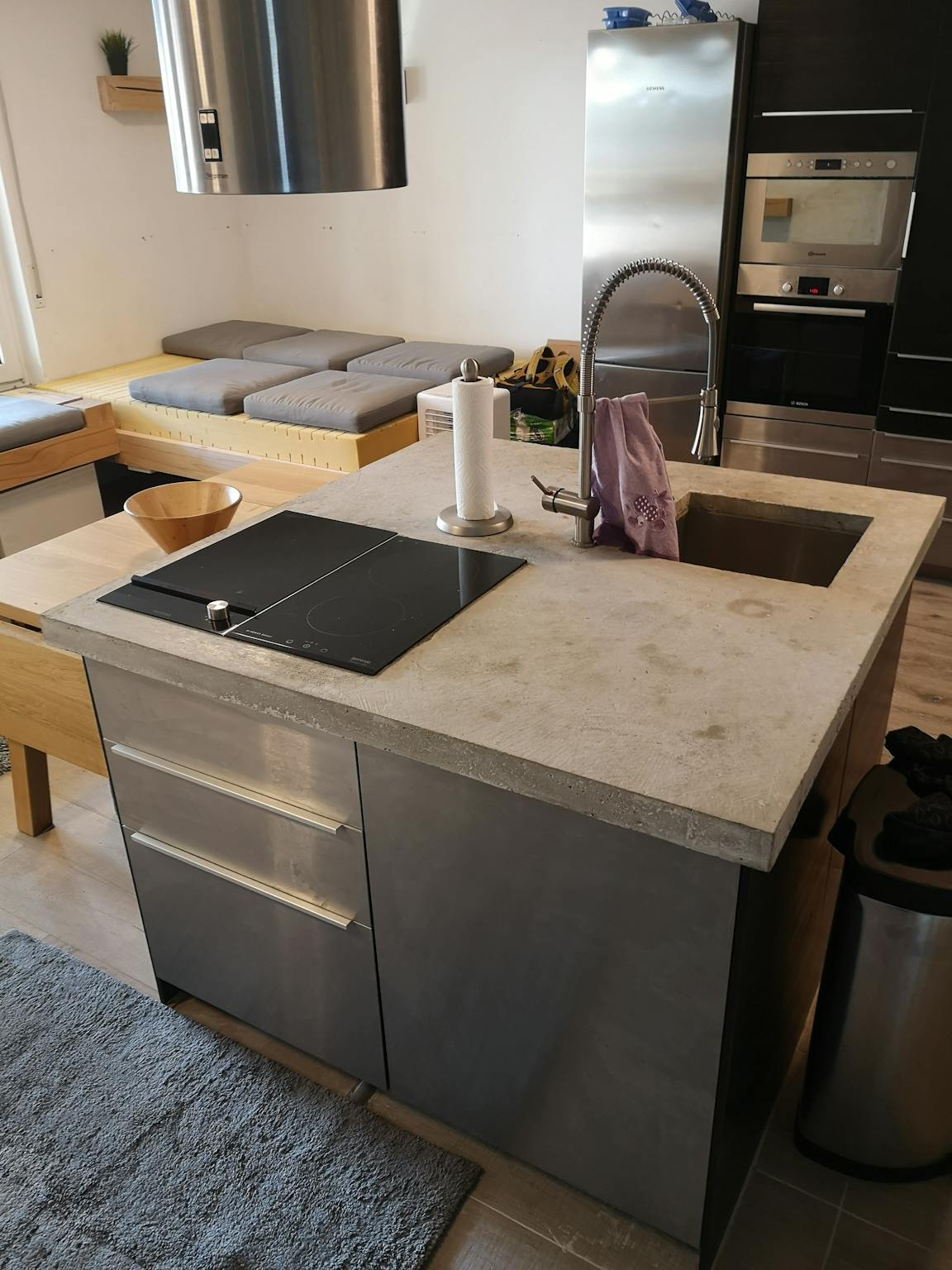 Die Küche ist vollausgestattet und besteht aus einer Kochinsel (Herd, Abzugshaube, Spülmaschine, Spülbecken, Waschmaschine) und einer Küchenzeile mit Microwelle, Backofen und einem Kühl/Gefrierschrank.
