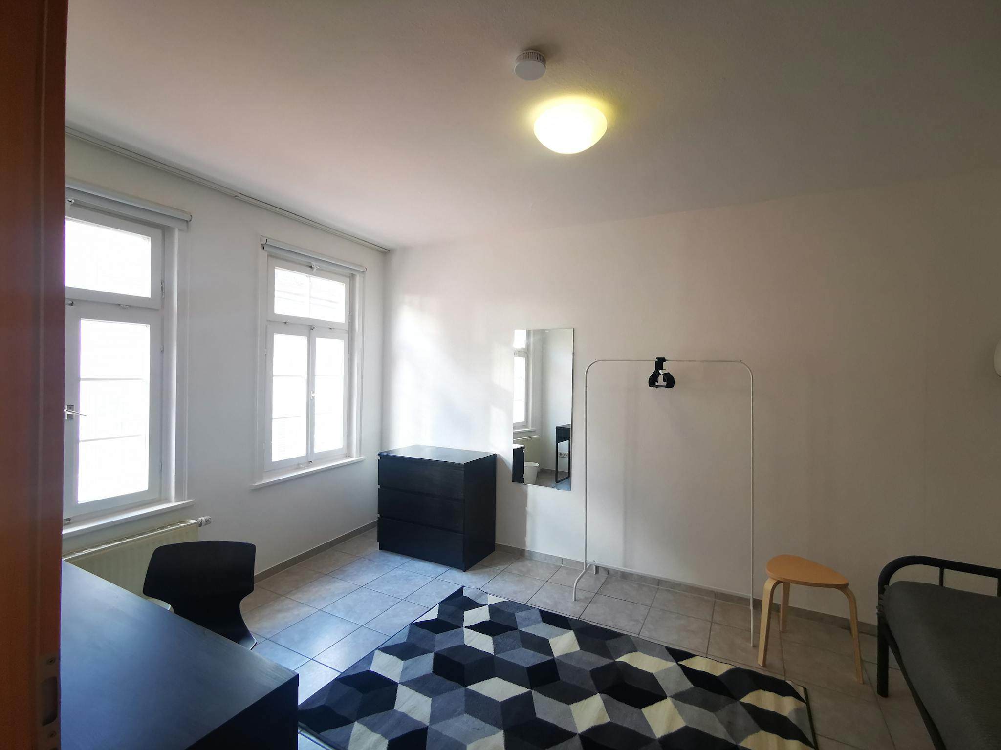 Jedes Zimmer ist funktional und modern eingerichtet und verfügt über ein Bett mit Bettwäsche und Handtüchern, Schreibtisch, Stuhl, Beleuchtung, großem Spiegel, Garderobenstange und Kommode.