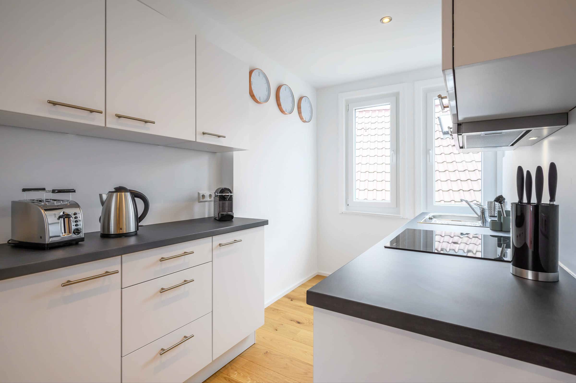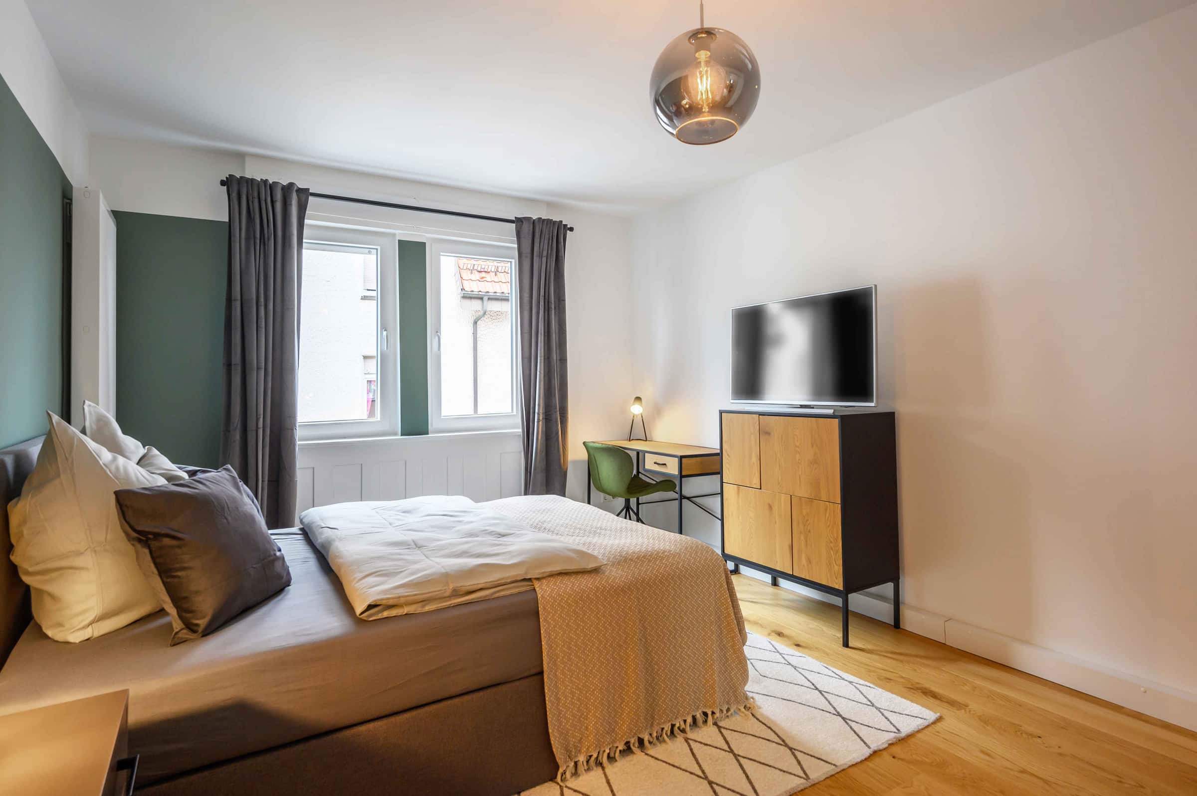 Our flats fulfil all your daily living requirements. Every flat comes readily equipped with a kitchen, including refrigerator, cooking equipment and dishes. Flats also include a washing machine and Wi-Fi Internet. Each room is fully furnished and offers a comfortable bed with fresh linen and a workspace. The area provides you with several shopping opportunities and excellent connections to public transport.