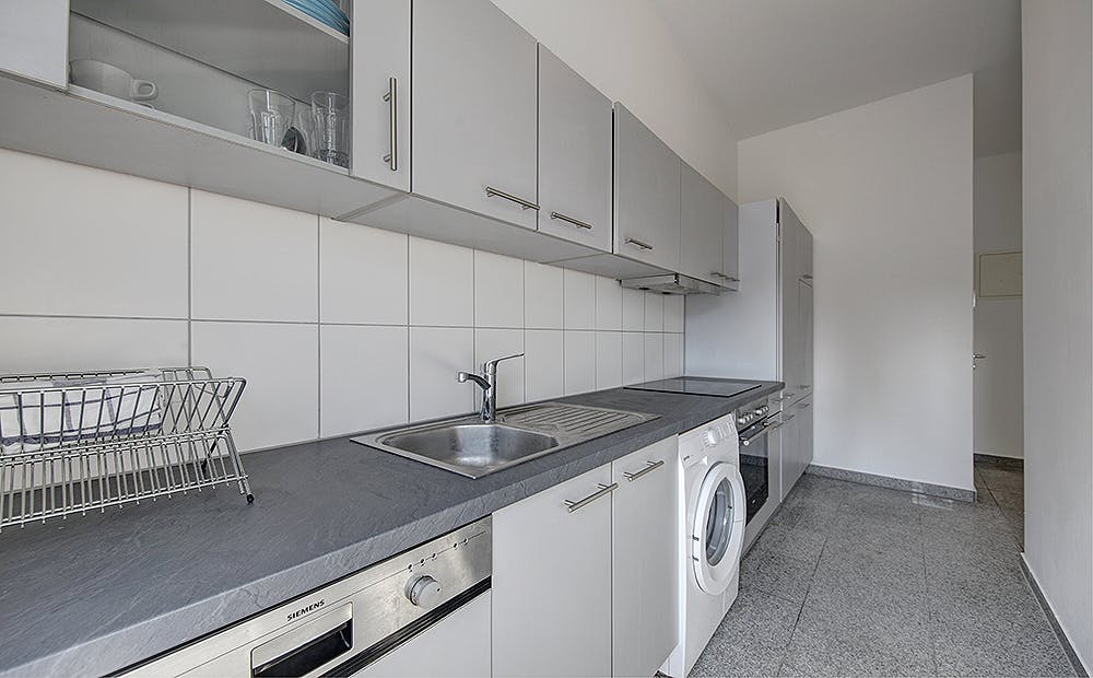 Our flats fulfil all your daily living requirements. Every flat comes readily equipped with a kitchen, including refrigerator, cooking equipment and dishes. Flats also include a washing machine and Wi-Fi Internet. Each room is fully furnished and offers a comfortable bed with fresh linen and a workspace. The area provides you with several shopping opportunities and excellent connections to public transport.