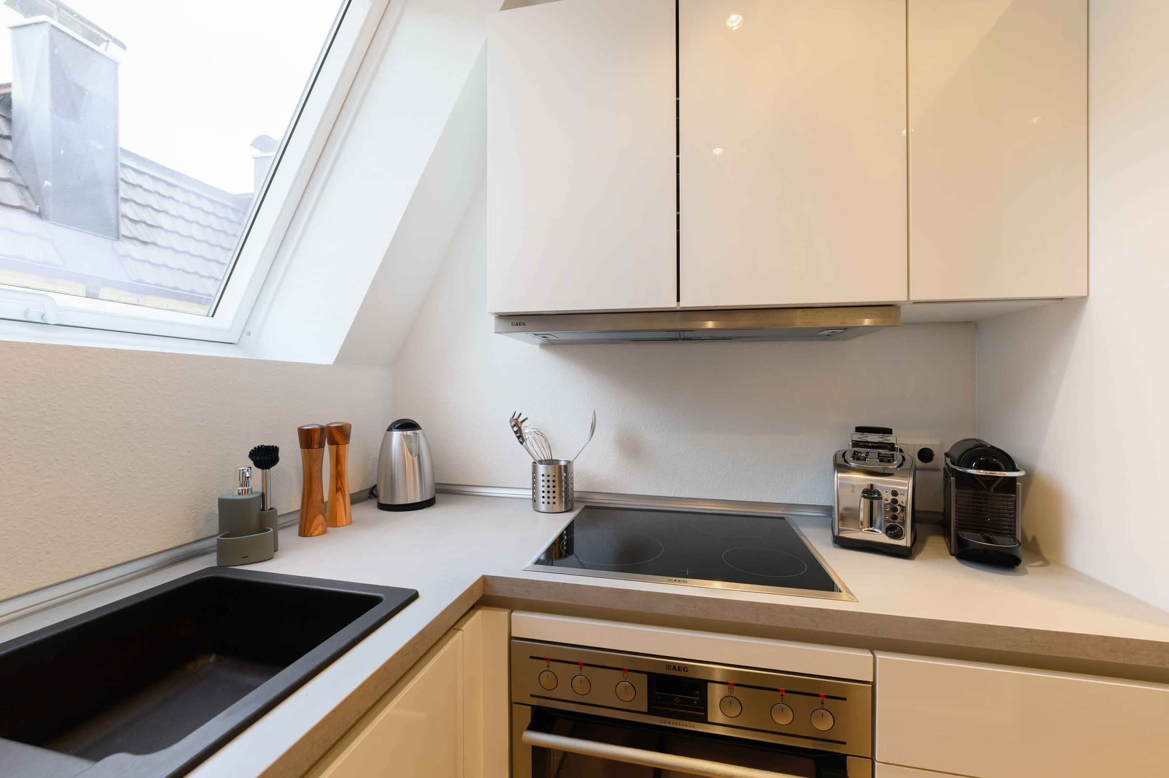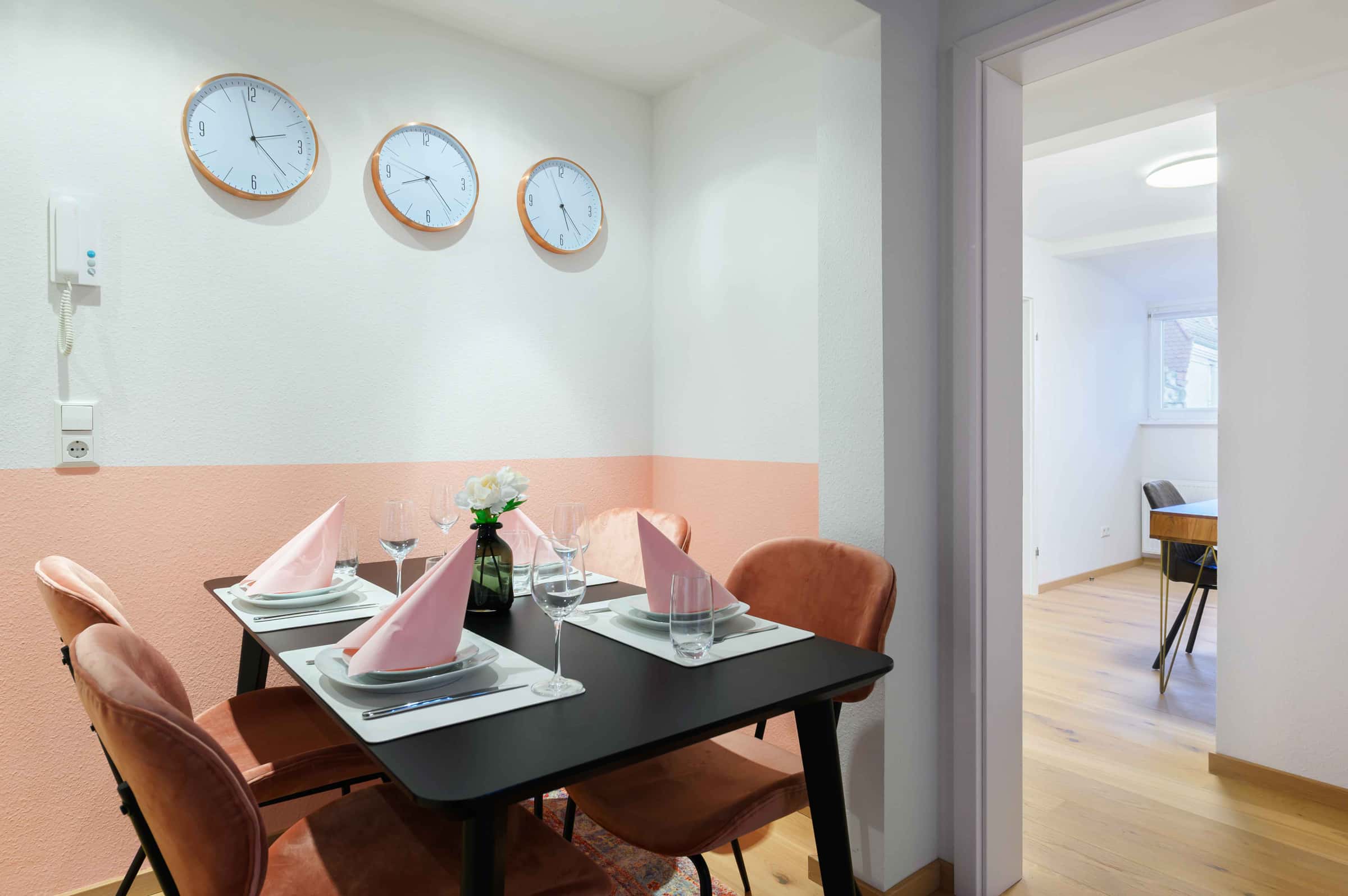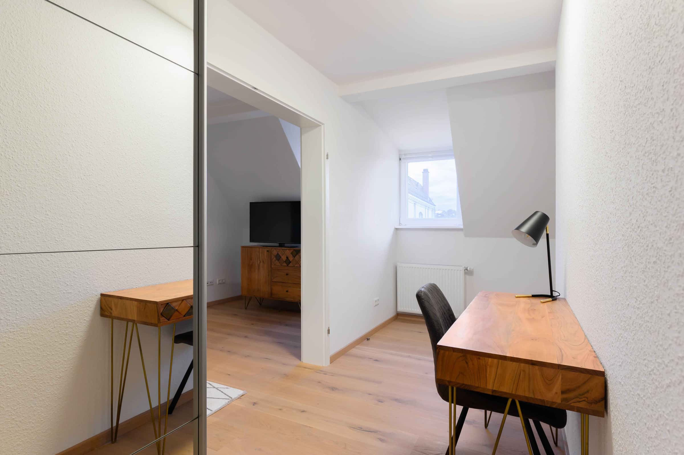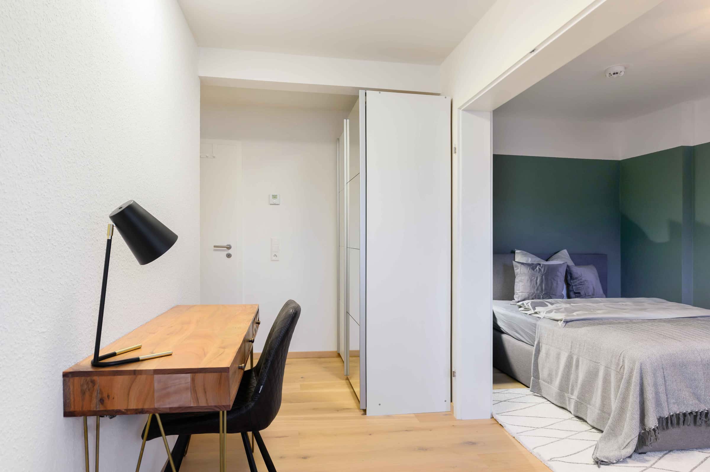 Our flats fulfil all your daily living requirements. Every flat comes readily equipped with a kitchen, including refrigerator, cooking equipment and dishes. Flats also include a washing machine and Wi-Fi Internet. Each room is fully furnished and offers a comfortable bed with fresh linen and a workspace. The area provides you with several shopping opportunities and excellent connections to public transport.